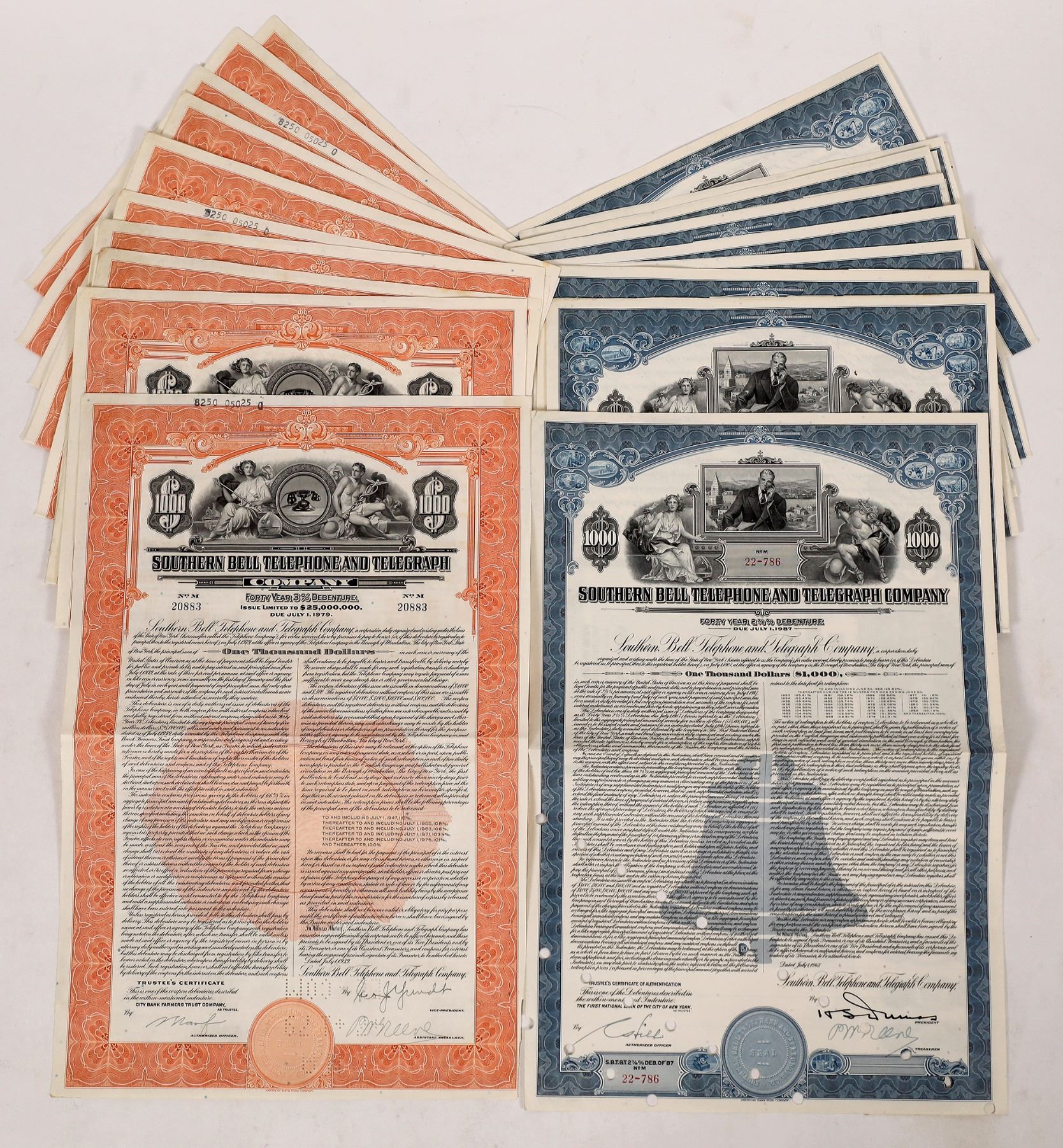 A collection of 21 $1000 bonds from Southern Bell Telephone and Telegraph Company, 10 are c1939, 11 are c1947. Please see photo(s) for more details. Ken Prag Collection