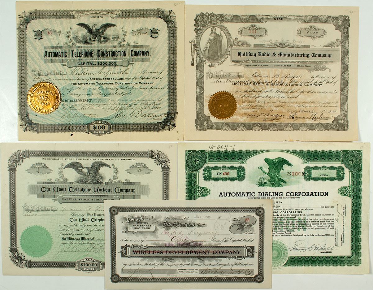Lot of 5: mix of various telephone-associated stocks from all over the country, such as the "Automatic Telephone Construction Company" (1896), "The Adsit Telephone Lockout Company" (1916, with 10c revenue stamp on reverse), the "Wireless Development Company" (1919, with receipt), "Holliday Radio & Manufacturing Company" (1925) and finally the "Automatic Dialing Corporation" (1946). Unique lot, all are in very good to excellent condition. (Prag Collection) City: State: Date: 1896-1946 hwac# 28948