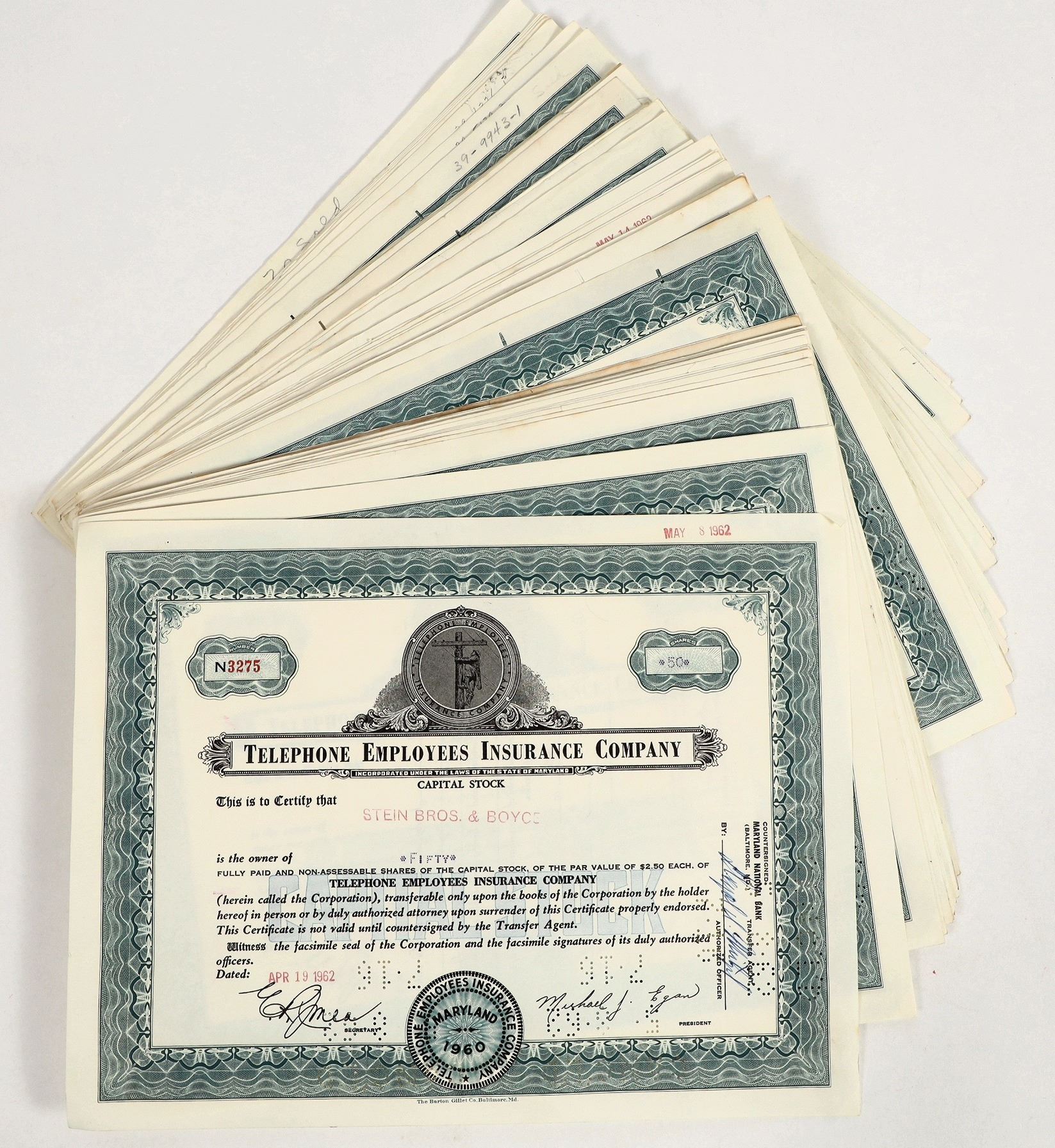 This is a group of Telephone Employees Insurance Co. stock certificates. Over 70 stocks in varied denominations issued in 1962. Please see photo for details.