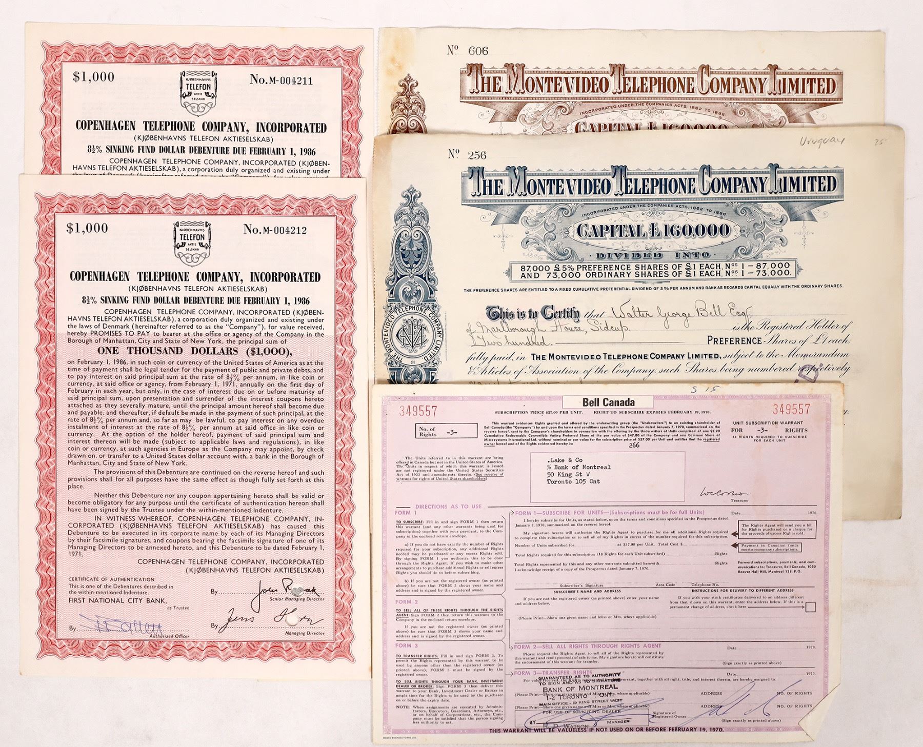 A collection of five foreign telephone equipment industry stocks and bonds, includes two certs c1908-10, and three bonds c1970-71. Please see photo(s) for more details. Ken Prag Collection
