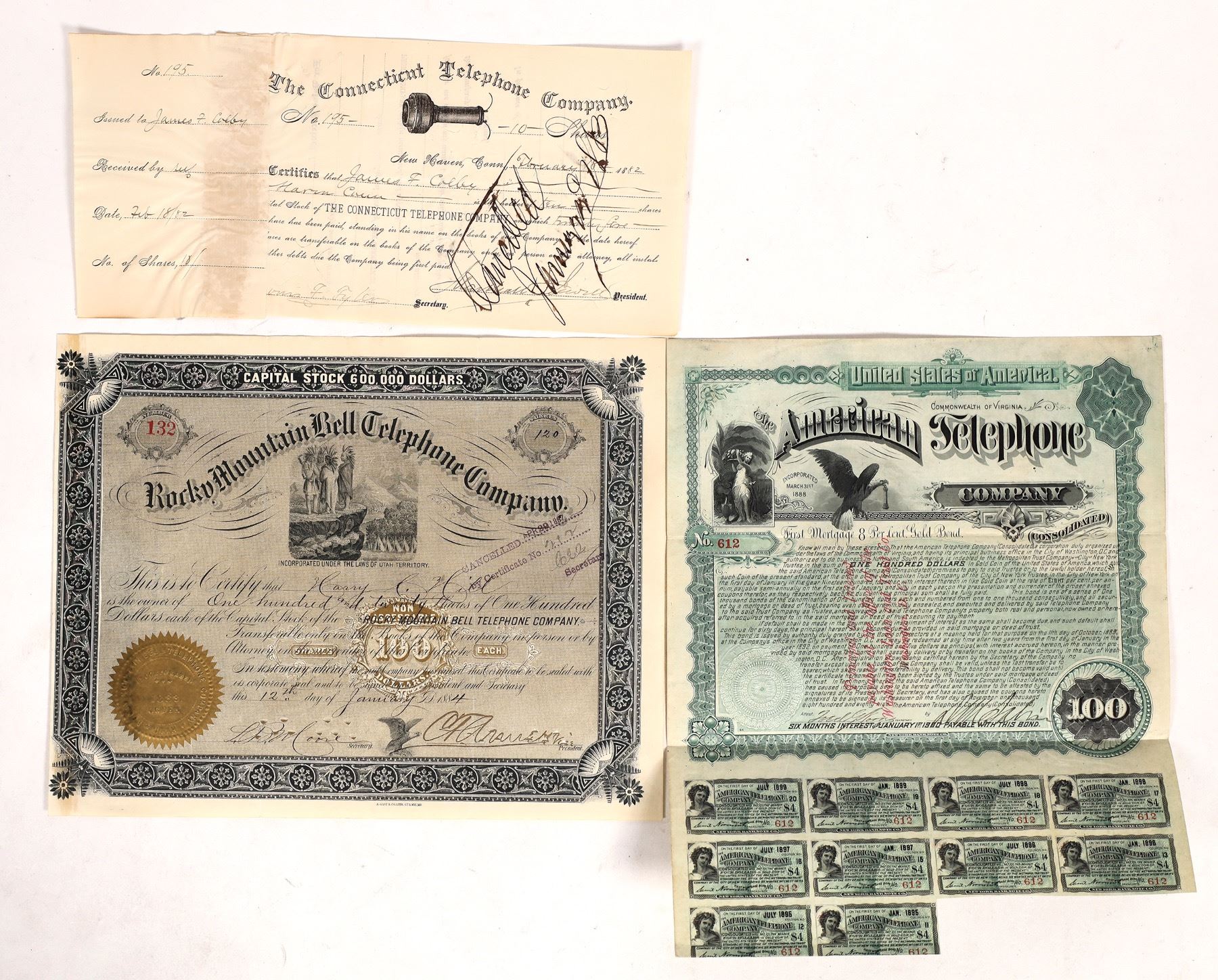 Lot of three. 1) Connecticut Telephone. # 195. Cancelled. 1882. Rocky Mountain Telephone. # 132. 1884. Unusual Native American vignette. Cancelled. Incorporated under the laws of Utah Territory. 3) American Telephone. Gold Bond. #612. 10 coupons attached. 1889.