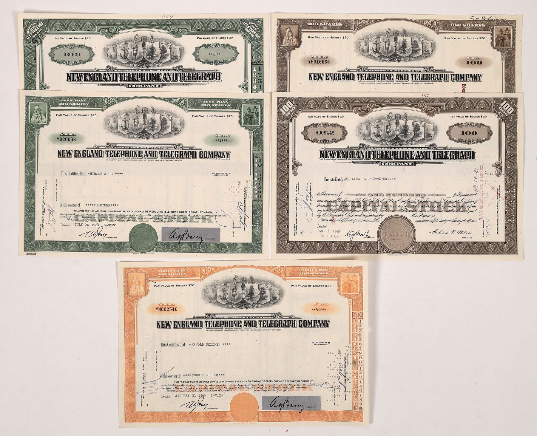 Group of five stock certificates, New England Telephone and Telegraph, c1960-64, nice vignette of shields.