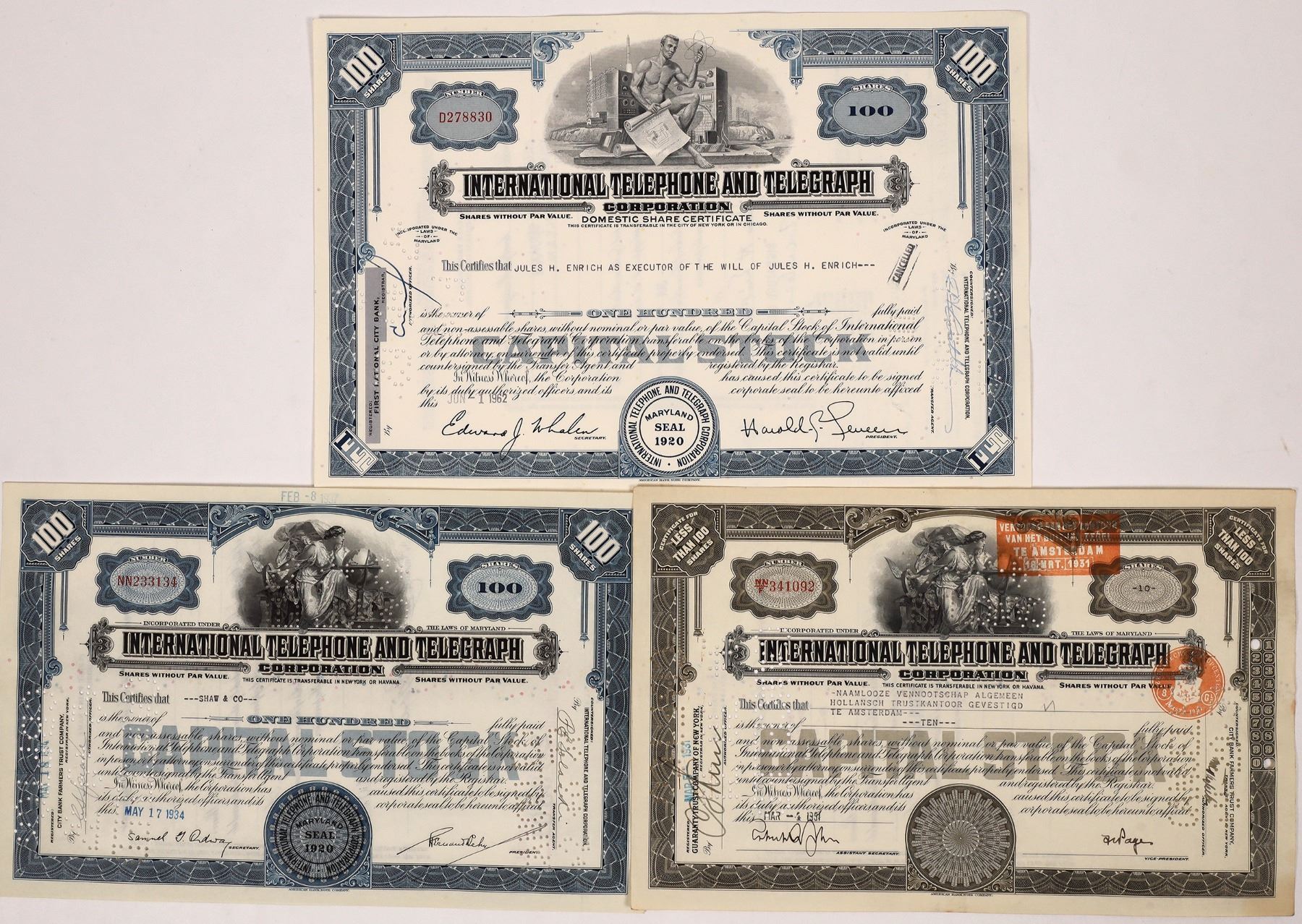 A trio of three different International Telephone and Telegraph stock certificates, c1931-62. Please see photo(s) for more details. Ken Prag Collection