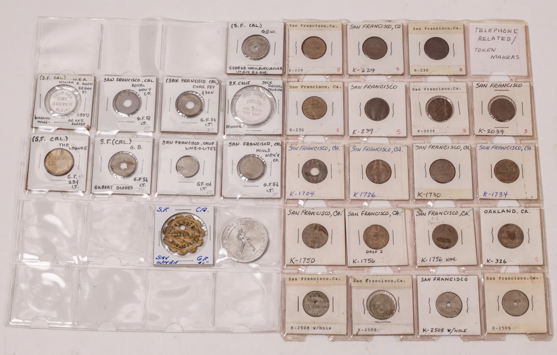 Lot of 28 San Francisco tokens, mostly telephone and token makers. Moise; Sunset Telephone and Telegraph; Patrick & Co.; Royal Novelty Co.; Chas. Fey & Son; Mills Novelty Co.; Line-O-Lites and merchant tokens: Jack Dougal jeweler; William E. Allen, boarding house; The Louvre; Gilbert Blodes.