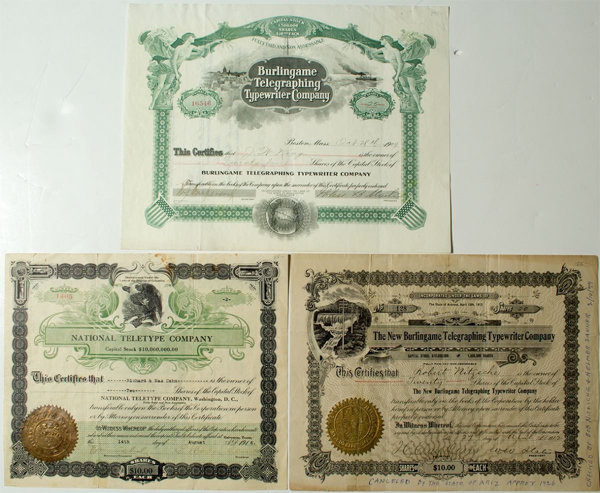 Three unique teletype stocks, from various parts of the nation. The "National Teletype Company" is dated 1916, from Washington D.C. The other (2) are the "Burlingame Telegraphing Typewriter Co." and the "New Burlingame Telegraphing Typewriter Co." dated 1909 and 1912 respectively. The Burligame company was originally incorporated in Washington, and manufacturing and offices were set up in Boston. Elmer Burlingame invented the telegraphing typewriter in 1906, and patented it in 1909. The certificate has great vignettes at each corner of women on Greek columns, with electricity shooting from their outstretched hands. The "New" Burlingame Company was incorporated in the state of Arizona. The sequence of their history is quite interesting. All (3) documents are in good to very good condition. (Prag Collection). City: State: Date: 1909-1916 hwac# 28946
