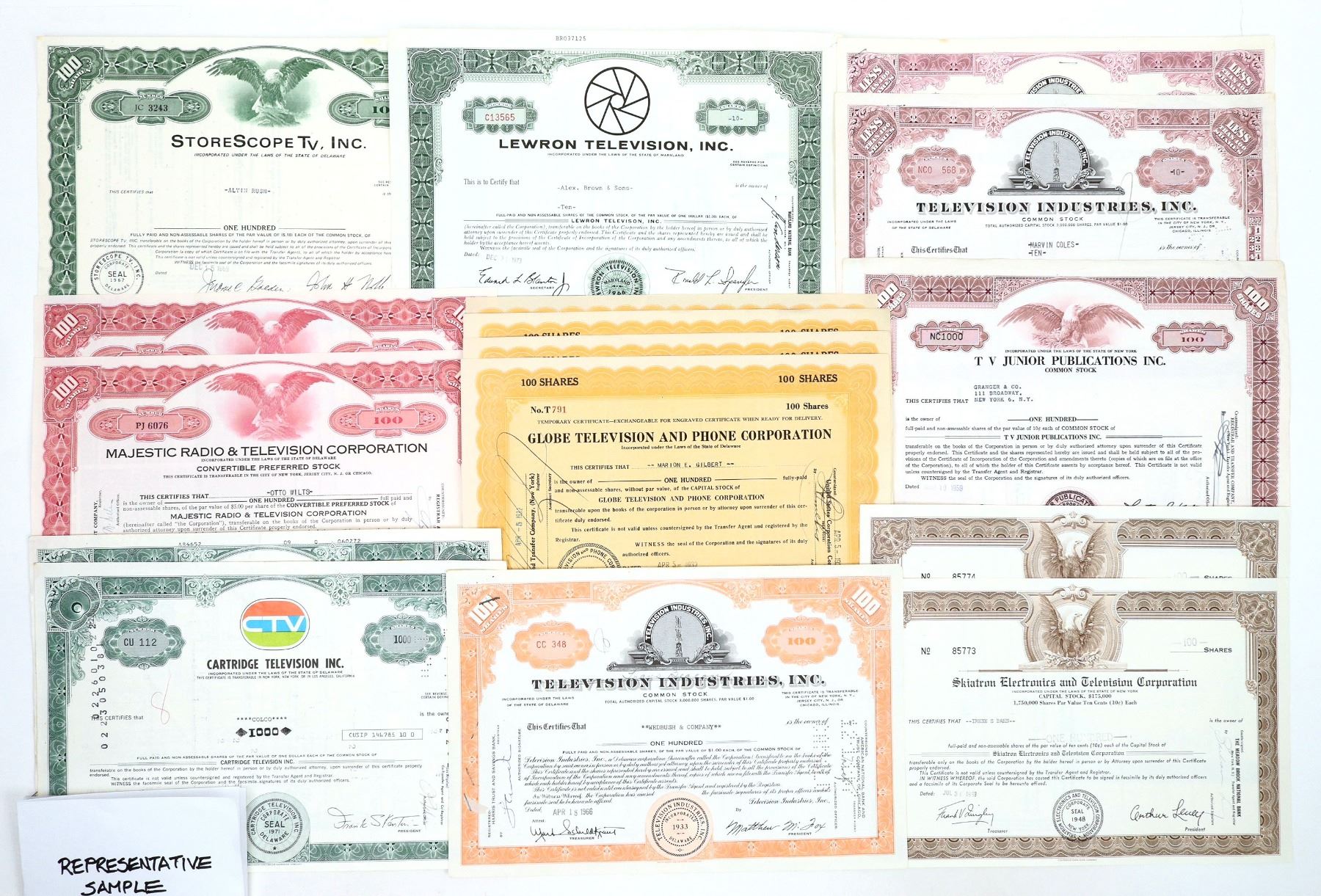 Issued-2x mauve 1958-64 and 1x 1966 orange Television Industries, 1x 1967 StoreScope Tv, 1x 1973 Lewron Television, 1x 1949 Majestic Radio & Television, 1x 1959 T V Junior Publications, 4x 1932 Globe Television and Phone, 1x 1970 Kittyhawk Television, 2x 1963 Stanton Electronics and Television, 2x 1972 Cartridge Television, 3x 1963-64 Four Star Television, 1x 1932 orange and 2x 1932 green Western Television, 2x 1932 Baird Television.