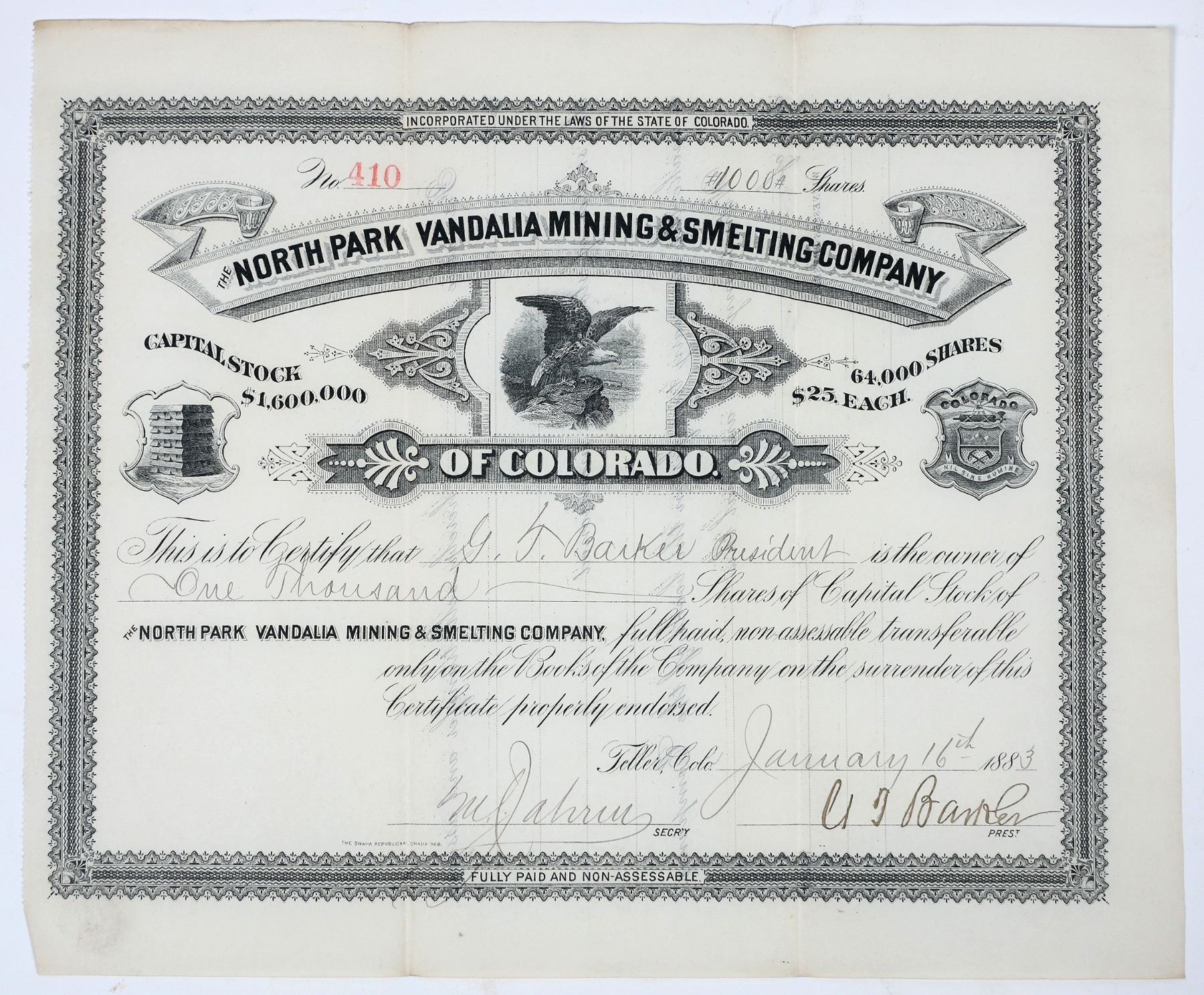 Every now and then we get in a special piece that warms my heart (FH). Here is a doozy, the North Park Vandalia Mining & Smelting Co., issued to company president G. T. Barker in 1882, datelined "Teller, Colo."
