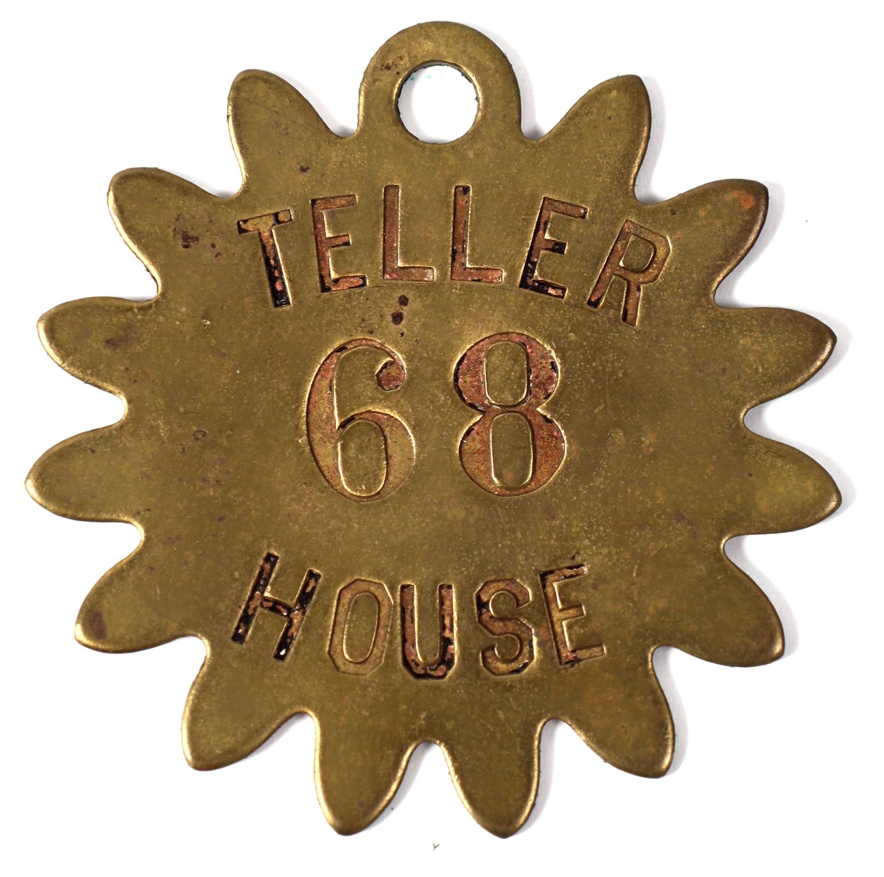 Teller, 68, House, brass key tag. 2". Built in 1872, a historic hotel in Central City, Colorado.