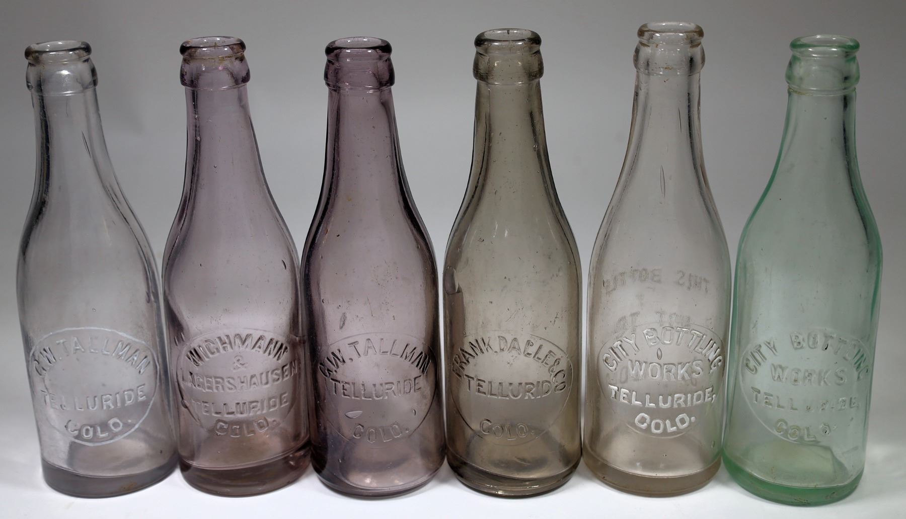 6 different Telluride crown top beer bottles. Clear-white embossed, C.W. Tallman/Telluride/Colo. City Bottling Works/Telluride, Colo.//This Bottle Not To Be Sold. Light aqua City Bottling Works/Telluride, Colo. C.W. Tallman/Telluride/Colo. Wichmann/& Lagershausen/Telluride Colo. Frank, Dalle & Co/Telluride/Colo.