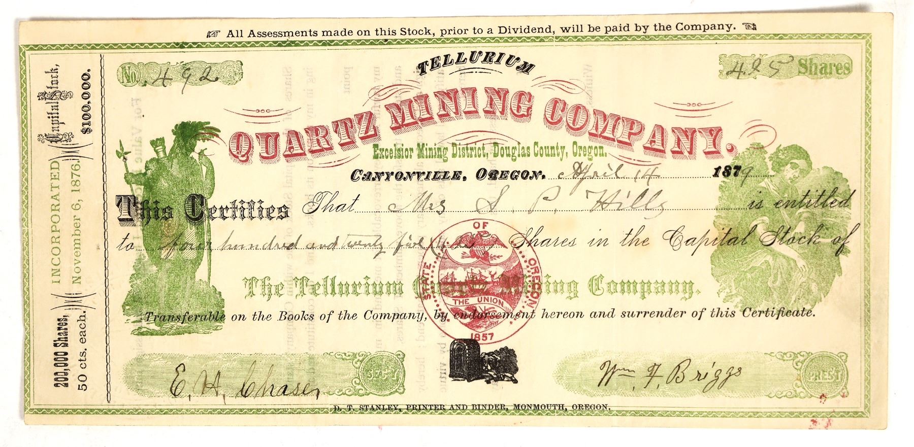 "Excelsior Mining District, Douglas County, Oregon" printed under title. Inc. 1876.# 492 for 425 shares to Mrs. SP Hills. Signed by EH Chasen (secretary) and WF Briggs (president). Not cancelled. Dateline Canyonville 1878. Another striking cert. Black, red and green on white. DT Stanley Printer and Binder, Monmouth, Oregon. Seal, Native American and allegorical vignettes. Folds, pinholes. IN Muncy was superintendent. Both the Corvallis and Albany newspapers reported fine specimens brought into their newspapers in 1878.