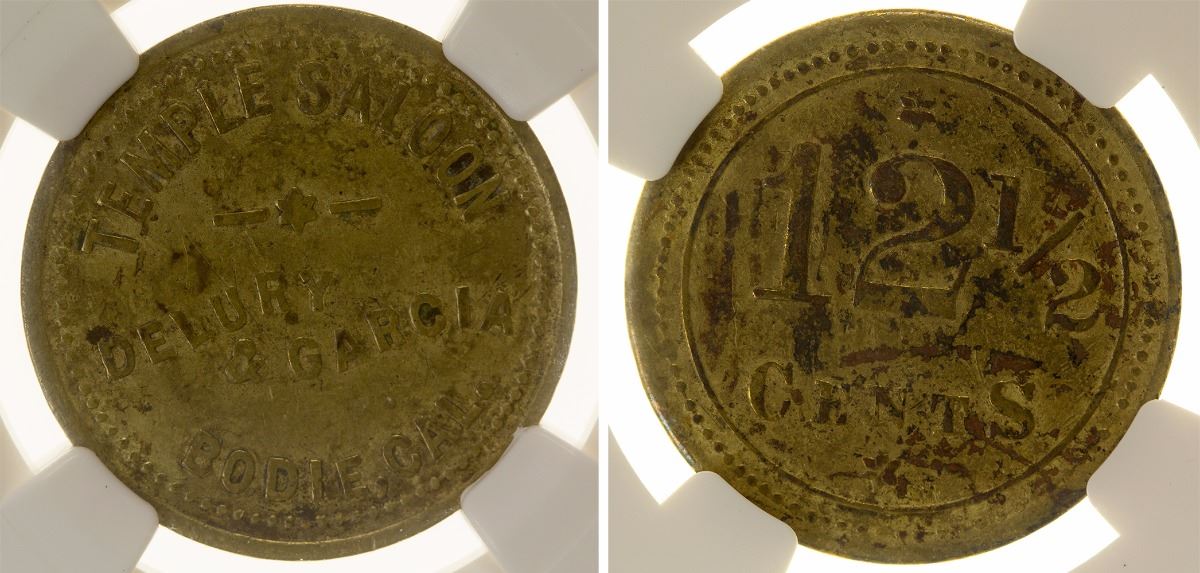 Ultra-rare Bodie token, c.1890. Temple Saloon / Delury & Garcia / Bodie, Cal. // 12 1/2 / Cents. NGC, XF 40. Brass, 25mm. Probably the finest known graded. Only known saloon token from this famous Mono County mining camp. George Delury's story is a familiar one for those who tried to strike it rich in California and Nevada. He first tried his luck on the Comstock Lode in the 1870s. There he met Isabella Ward, who would later become his wife in 1888. When Virginia City began its decline, George followed the excitement south and joined his brother John in Bodie in 1882. (John had been working as a butcher in Kilgore's Union Market on Main Street.) George bought the Temple Saloon with Rosalio Garcia in the late 1880s. The Temple burned down in 1892, but they rebuilt it. That same year, Delury was elected Justice of the Peace for the Bodie Township. Delury also served on the Wide Awake Hose Company (Bodie Fire Department). Bella married him in Bodie in 1888 but returned to her home town (Virginia City) to give birth to their two children: Eva in 1889, and Savilla in 1892. [Ref: Mono County Historical Society 2015 Newsletter, The Delury Monopoly] State: California City: Bodie Date: FHWAC#: 43803