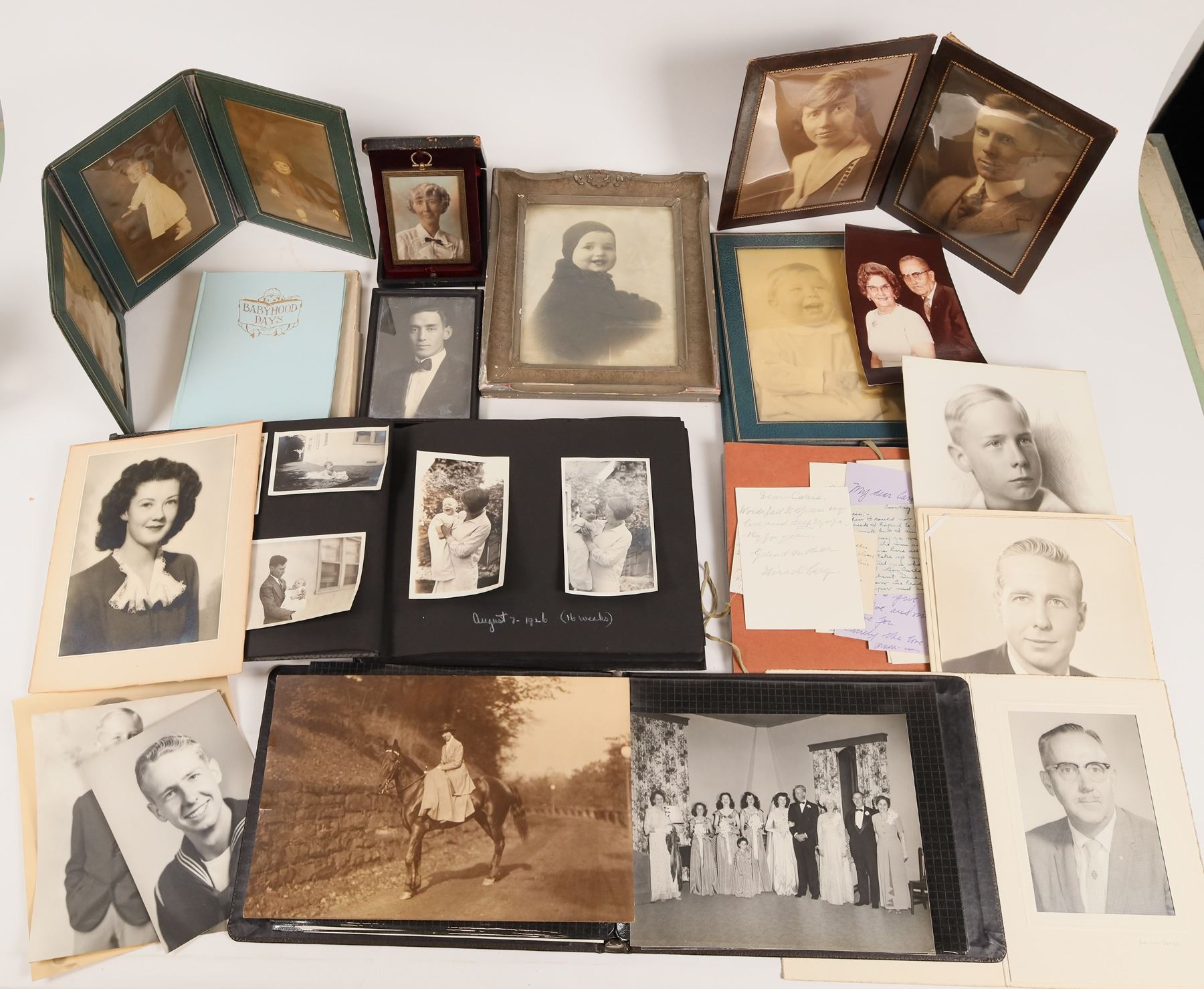 c. 1930's Hollywood/Pasadena, CA Templeton family archive. File on death of Eugene Templeton, 1945 panoramic Elliot Jr. HS class photo with back autographs, correspondences, 8x10" wedding photos, vintage baby then child photo album, lots of other photos and portraits.