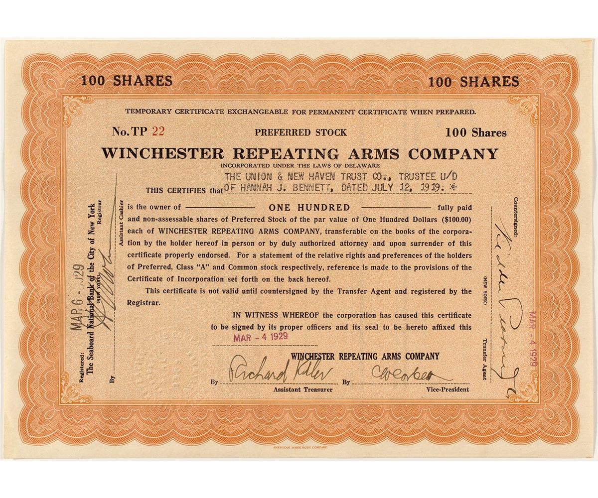 Temporary certificate exchangeable for permanent certificate when prepared. No. TP 22 issued to the Union & New Haven Trust Co., Trustee of Hannah J. Bennett, for 100 shares. It is not cancelled, and has little wear.City: County: State: Date: 1929