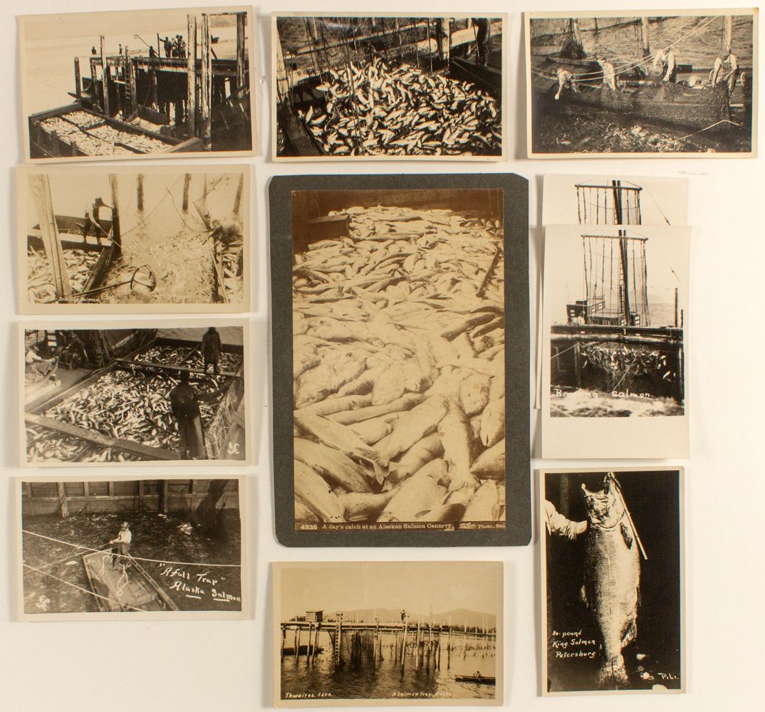 Various sizes. Includes brailing salmon, salmon traps, Thwaites Alaska, one King salmon. All unused. Photo shows a day's catch at an Alaskan Salmon Cannery. (Prag Collection)