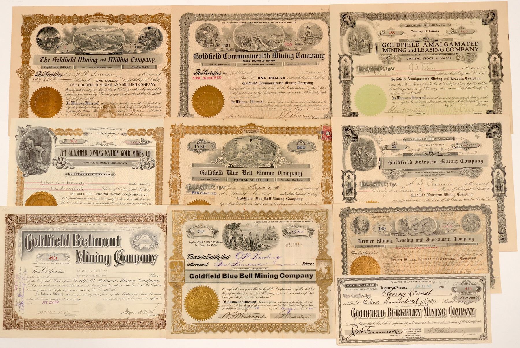Lot of 10 different. Includes: Brewer Mining, Leasing & Investment Co. (1906); Goldfield Blue Bell MC (1906); Goldfield Berkeley MC (1908); Goldfield Belmont MC (1912); Goldfield Blue Bell MC (1905); Goldfield Coming Nation Gold Mines Co. (1904); Goldfield Amalgamated Mining & Leasing Co. (1907); Goldfield Mining & Milling Co. (1903); Goldfield Commonwealth MC (1905); and Goldfield Fairview MC (1905). Fair to good. Please inspect. Ken Prag Collection