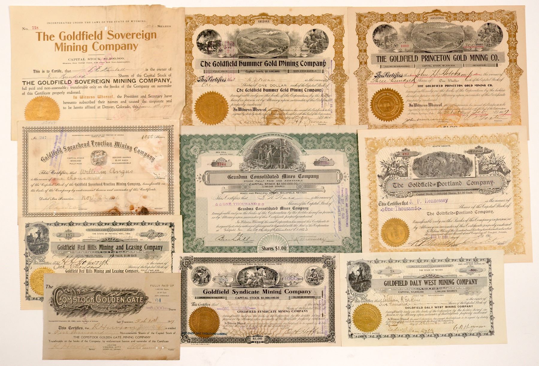 Lot of 10 different. Included: Goldfield Hummer GMC (stock number TWO, 1904); Goldfield Syndicate MC (1907); Grandma Cons. Mines Co. (1923); Goldfield Daly West MC (1906); Goldfield-Portland Co. (1907); Goldfield Red Hills Mining & Leasing Co. (1908); Comstock Golden Gate MC (1907); Goldfield Spearhead Traction MC (1906); Goldfield Sovereign MC (1905); and Goldfield Princeton GMC (1907). Poor to good condition; please inspect. Ken Prag Collection