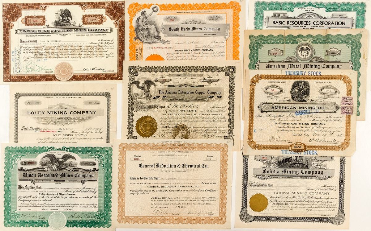 Another batch of ten different. Includes: Boley Mining Co. (1916, not cxl), The Arizona Enterprise Copper Co. (1912, not cxl), Basic Resources Corp. (1964, not cxl), Union Associated Mines Co. (1930, not cxl), Mineral Veins Coalition Mines Co. (1926, not cxl), South Hecla Mines Co. (1921, not cxl), American Metal Mining Co. (1921, not cxl, tape repairs), American Mining Co. (1901, stamp cxl, mining vignette), General Reduction & Chemical Co. (1919, not cxl), and Godiva Mining Co. (unissued 190-, mining vignette). (Prag Collection) City: State: Utah Date: 1901-1964 hwac# 34678