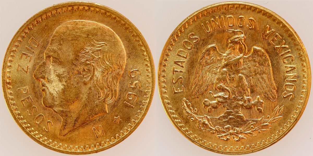 KM#473. During 1961-1972, a total of 954,983 pieces were restruck dated 1959. 8.33 grams, .900 gold, .2411 oz. AGW. EF-AU. State: Mexico City: Date: 1959 FHWAC#: 43538