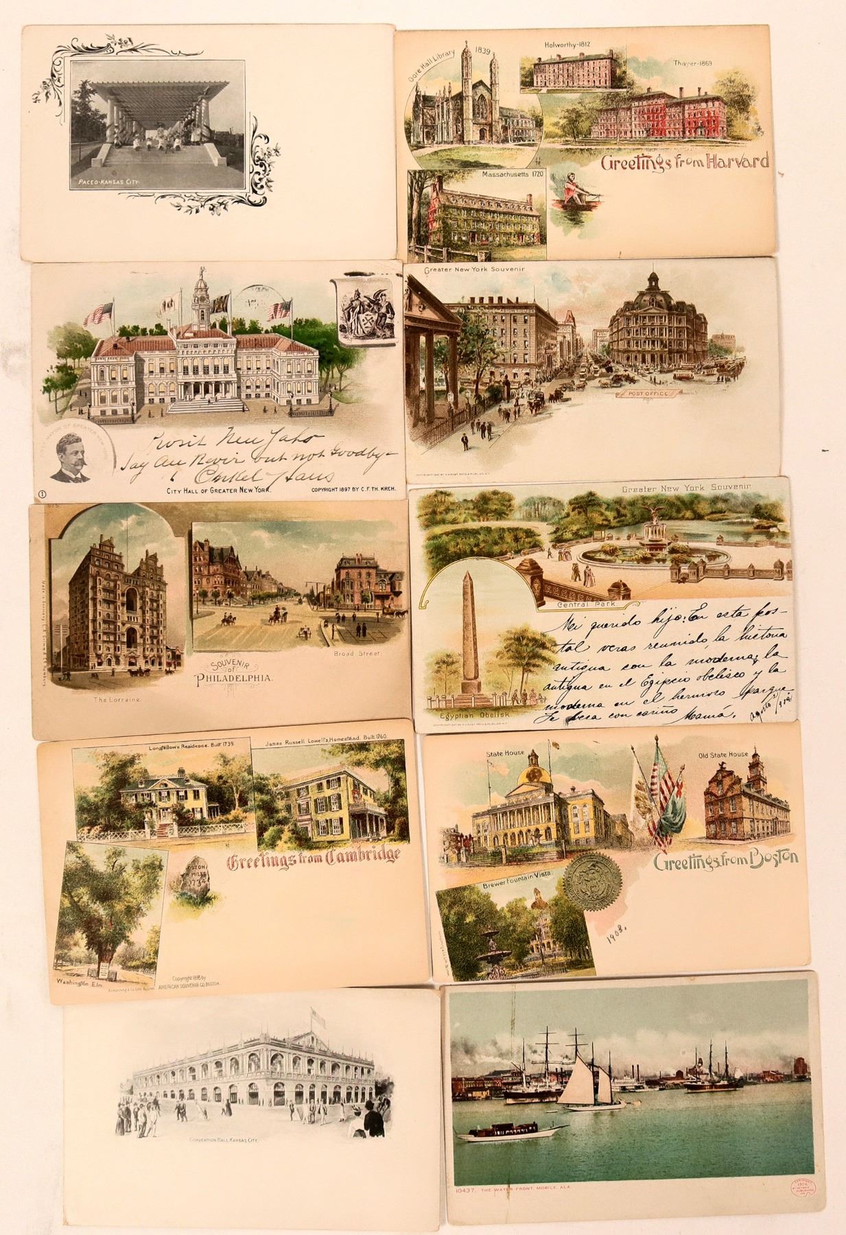 Lot of 10 pioneer postcards, some of the earliest postcards made in America, c1895-1906. Includes greetings from U.S. cities like Boston, Philadelphia, New York, and places such as Cambridge and Harvard. Seven are blank, and three canceled from Boston, 1902; Brooklyn, 1902; and New York, N.Y., 1898. See photo for details.