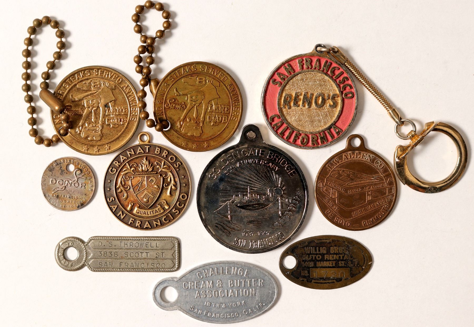 Ten assorted pocket fob collection. Golden Gate Bridge, Reno's, Granat Bros., Willig Bros., Sam's Lane Club plus others.