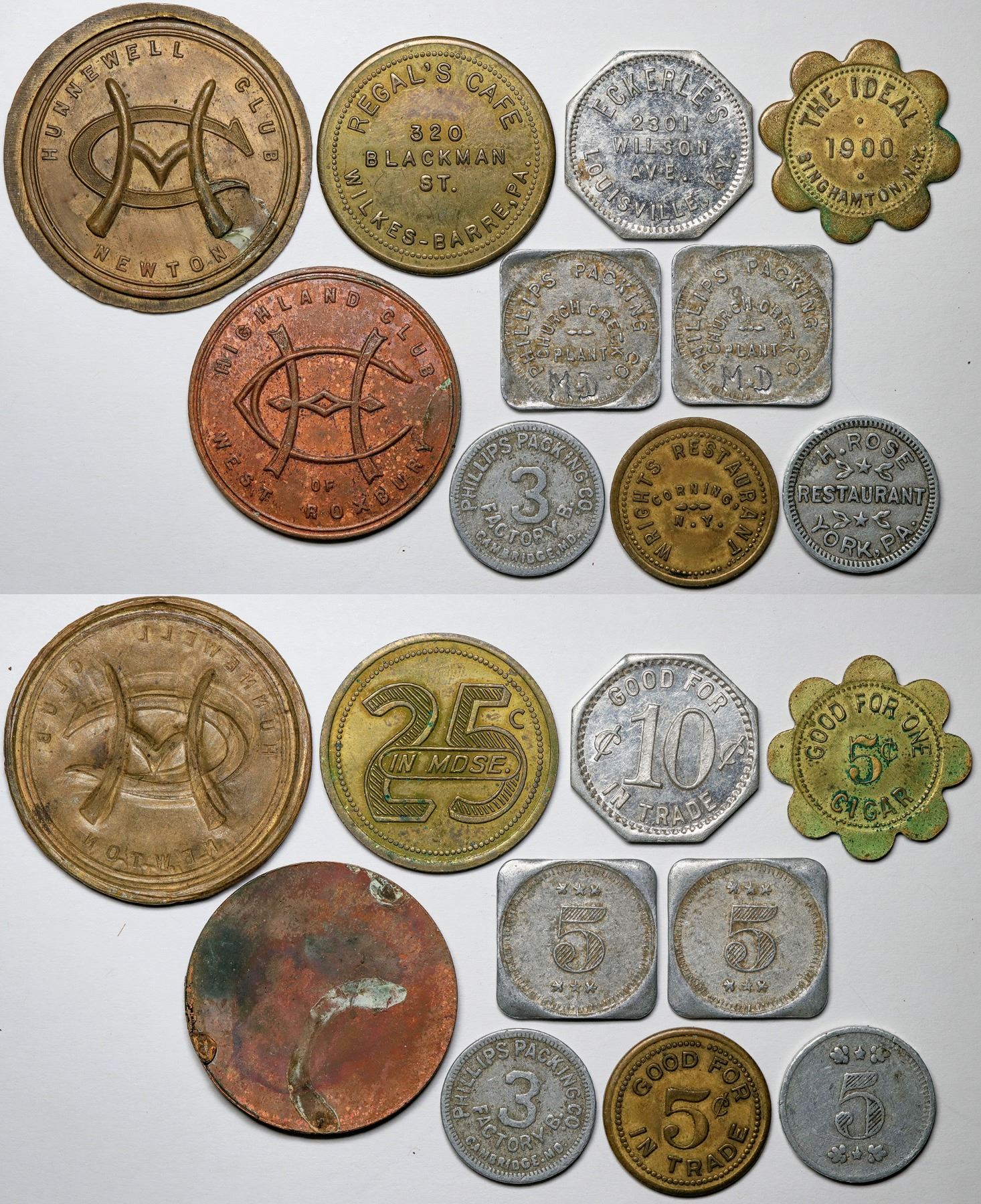 Group of 10 U.S. tokens, from NY, PA, KY, MD, MA and more U.S. cities, c1800s-1900s. Includes two bronze 1-1/4 inch Uniface H.U.N. Newell Club, Newton, Mass. and Highland Club, W. Roxbury, Mass.; silver 3/4 inch H. Rose Restaurant, York, Pa. and copper Wright's Restaurant, Corning, NY, both good for 5 cents, and six more.