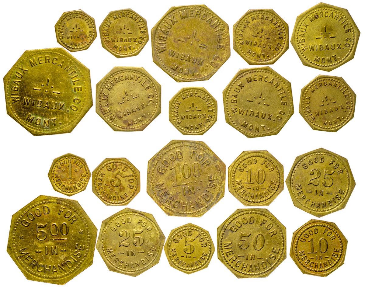 Wibaux Mercantile Co. / Wibaux / Mont. // GF / 1c, 5c (two), 10c (two), 25c (two), 50c, $1.00, $5.00 / In / Merchandise. Octagonal, Brass. Types one and two. (Svoboda Collection) City: Wibaux State: Montana Date: HWAC# 35873