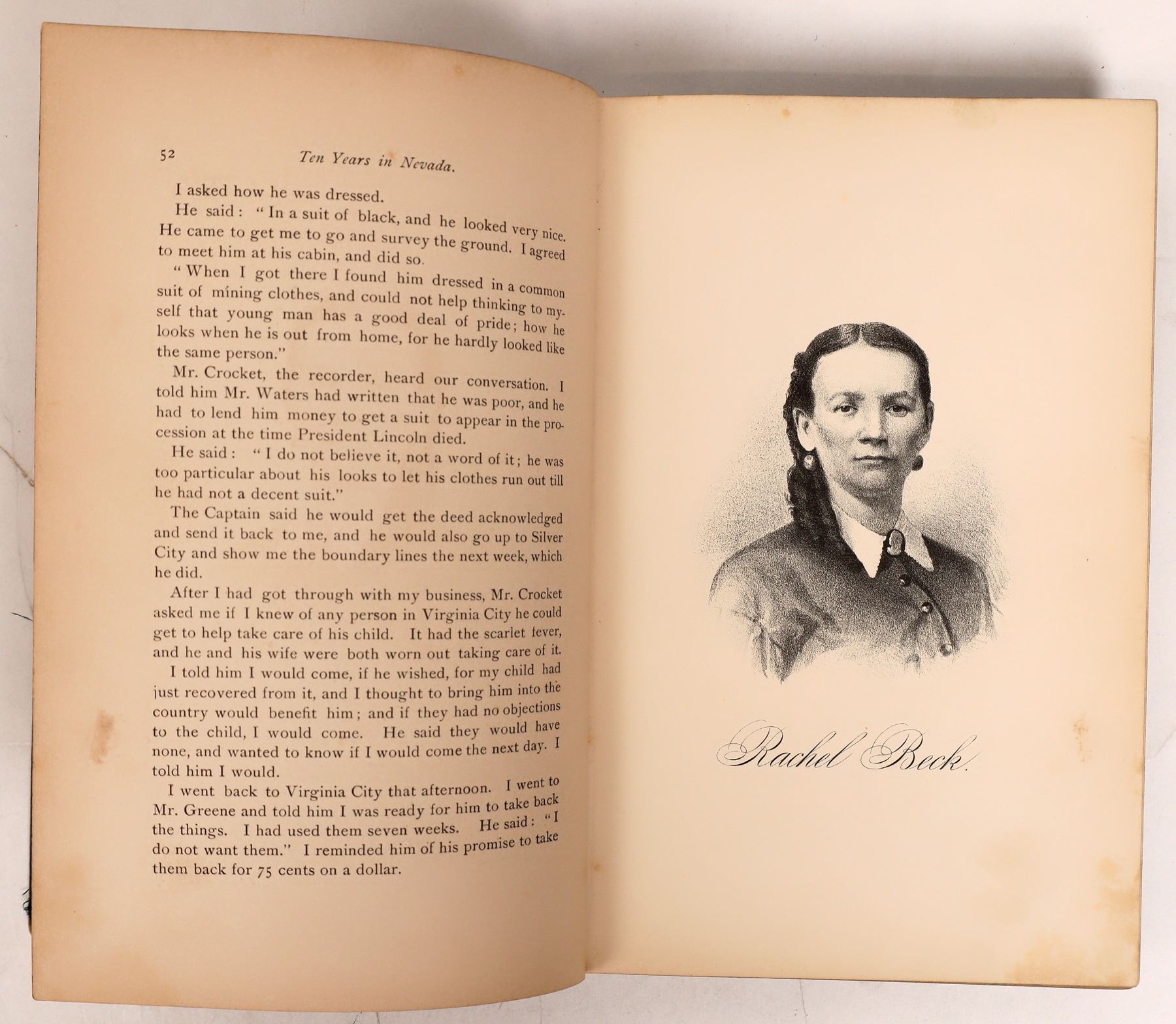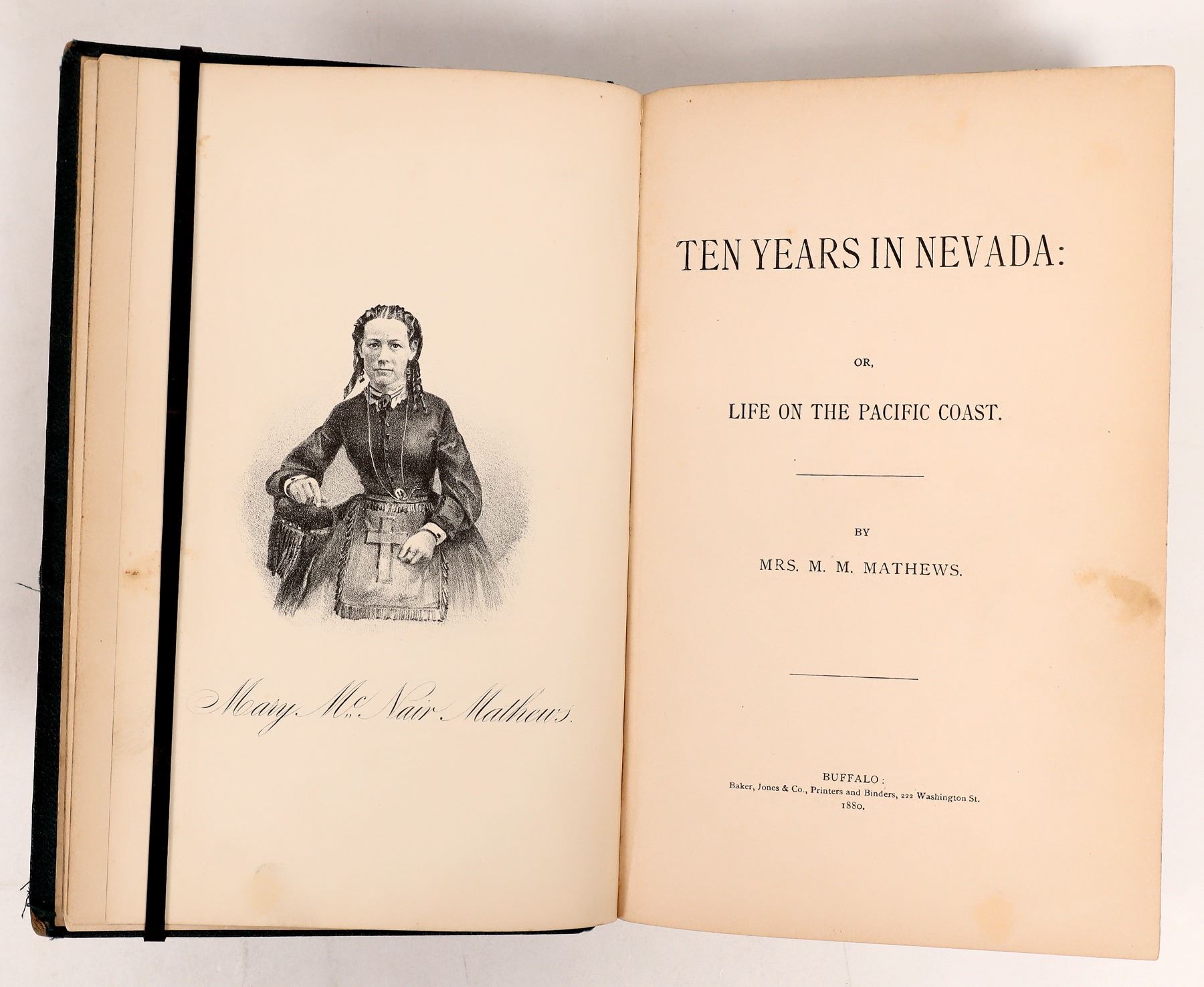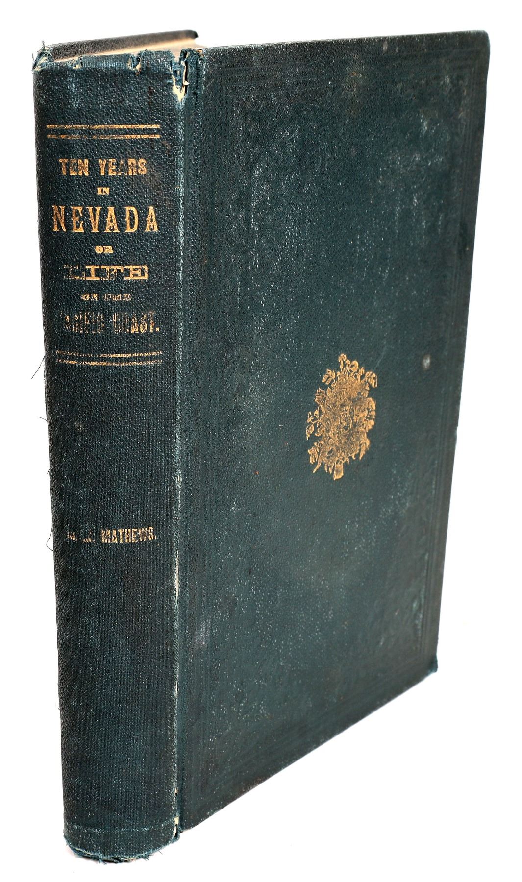 Gilded cover Ten Years in Nevada: or, Life on the Pacific Coast by Mrs. M M Mathews. 1880. First Edition. The account of lone woman traveling West with her son, on the newly completed transcontinental railroad in 1869, and spent nearly ten years in the turbulent environment of the Comstock's mining camps and towns, including Virginia City and her experiences, including attacks, swindles, lawsuits, and other adventures. She went to Nevada with her son to investigate the murder of her brother. She spent 10 years in Nevada and California mining camps. She survived by sewing and investing in mining stocks. A fascinating account in rough mining towns of the West. 343pp with TOC. Not in Graff or Cowan, Howes USiana M-417; Howes II: M-416. Inner front spine splitting, some foxing. Please inspect.