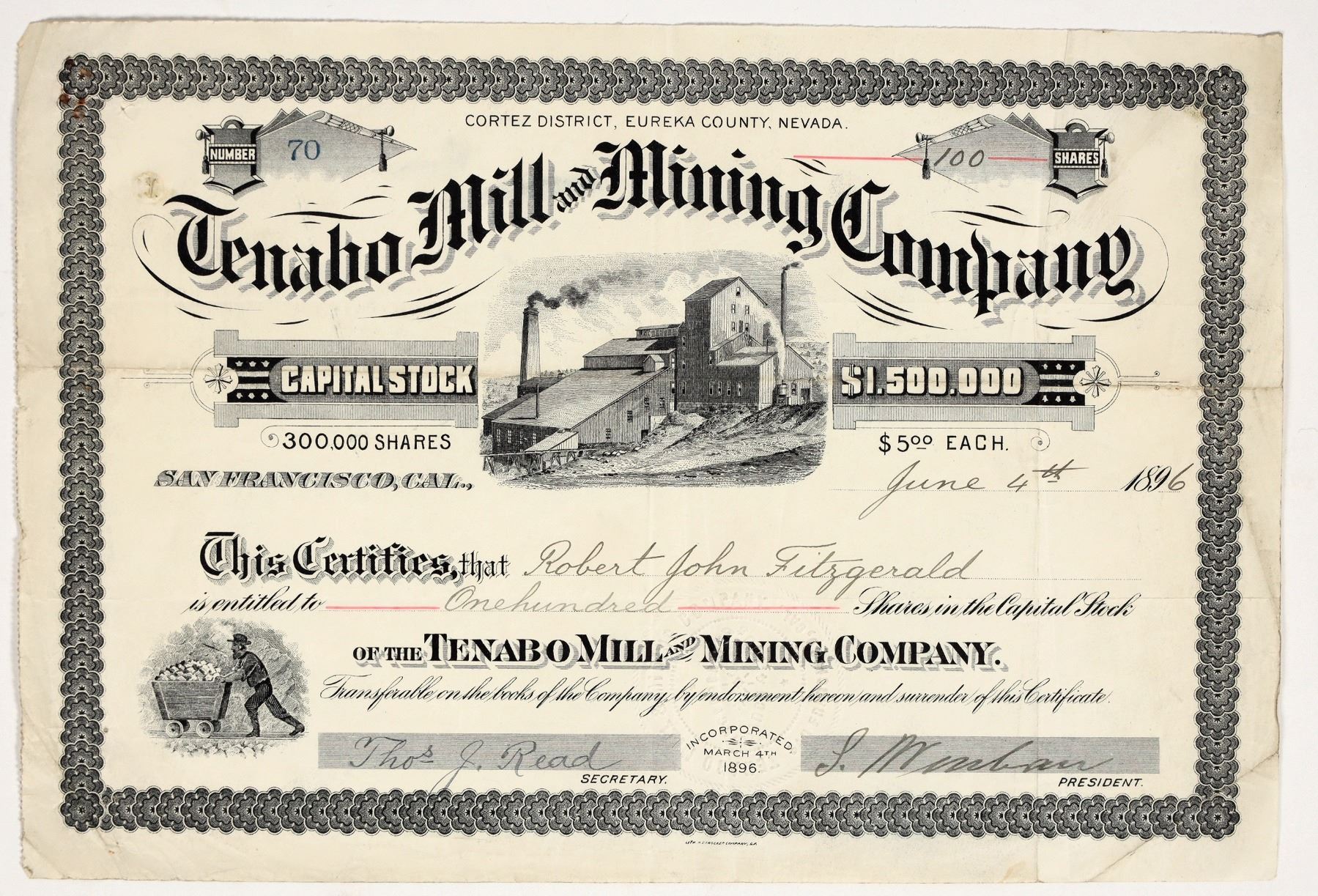 Extra rare! Signed by one of the early important figures for this district. Location Cortez District, Eureka County, Nevada (printed top center). Inc. March 4th, 1896. No. 70, issued for 100 shares to Robert John Fitzgerald on June 4th, 1896. Signed by S. Wenban as president and Thos. J. Read as secretary. Not cancelled. Vignette of mill facility (center) and miner pushing a full ore cart (bottom left). Pinholes, deep folds, creased corners, and some soiling. Overall nice. 7.5 x 10.75" Crocker print. The Cortez Mining District was organized in 1863 and saw early investments from George Hearst. While the ore was initially sent to Austin for processing, in 1864, the miners constructed a Washoe Process pan amalgamation mill. In 1865, they installed Reese River Process equipment. Simeon Wenban was an early mining figure in the district. He bought the mill in 1869 to work ore from the Garrison Mine. He replaced his Cornish and Welsh workers with Chinese immigrants. In 1886, Wenban built a new mill with Russell leaching technology, considered state-of-the-art. This mill was closed in 1892. Wenban died in 1901. According to the obituary in the San Francisco Call, Wenban came to the US at the age of 4 from England. His family travelled to the California Gold Rush in 1854. He died from a heart attack while still president of this mining company. He also owned the Wenban Hotel in SF. In 1908, a new company reworked Wenban's abandoned mill with cyanide leaching technology and used it to process old mill tailings. That mill burned in 1915. The Cortez Mining District is now the site of an open pit mine. [Ref:ONE]