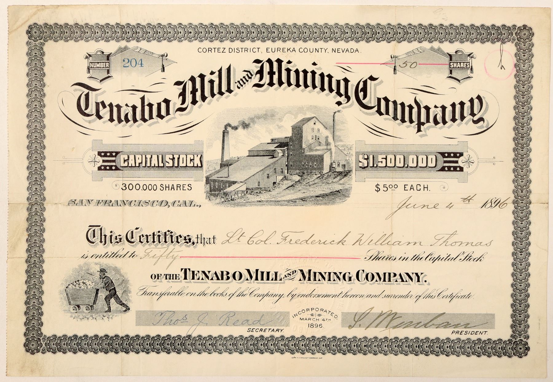 Extra rare! Signed by one of the early important figures for this district. Location Cortez District, Eureka County, Nevada (printed top center). Inc. March 4th, 1896. No. 204, issued for 50 shares to Lt. Col. Frederick William Thomas on June 4th, 1896. Signed by S. Wenban as president and Thos. J. Read as secretary. Not cancelled. Vignette of mill facility (center) and miner pushing a full ore cart (bottom left). Pinholes, deep folds, creased corners, and some soiling. Overall very nice. 7.5 x 10.75" Crocker print. The Cortez Mining District was organized in 1863 and saw early investments from George Hearst. While the ore was initially sent to Austin for processing, in 1864, the miners constructed a Washoe Process pan amalgamation mill. In 1865, they installed Reese River Process equipment. Simeon Wenban was an early mining figure in the district. He bought the mill in 1869 to work ore from the Garrison Mine. He replaced his Cornish and Welsh workers with Chinese immigrants. In 1886, Wenban built a new mill with Russell leaching technology, considered state-of-the-art. This mill was closed in 1892. Wenban died in 1901. According to the obituary in the San Francisco Call, Wenban came to the US at the age of 4 from England. His family travelled to the California Gold Rush in 1854. He died from a heart attack while still president of this mining company. He also owned the Wenban Hotel in SF. In 1908, a new company reworked Wenban's abandoned mill with cyanide leaching technology and used it to process old mill tailings. That mill burned in 1915. The Cortez Mining District is now the site of an open pit mine. () [Ref:ONE] Ken Prag Collection