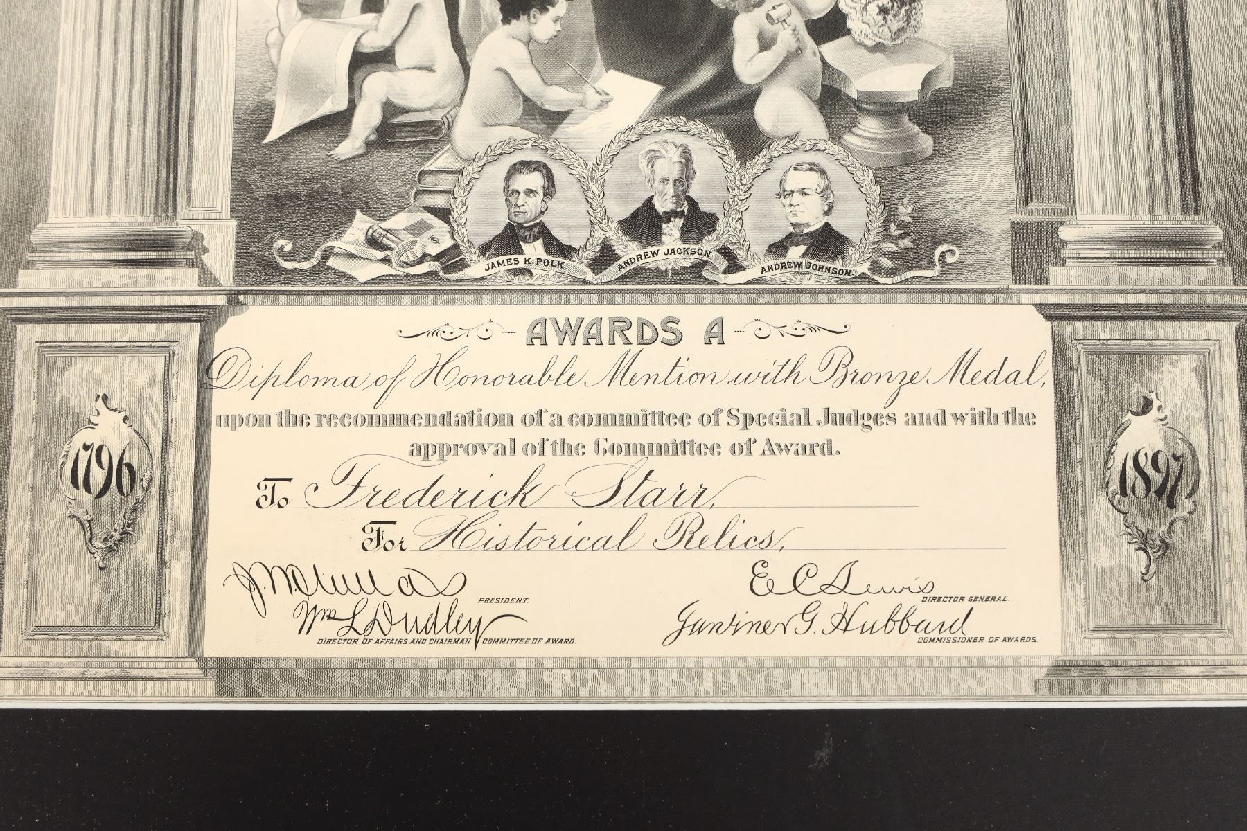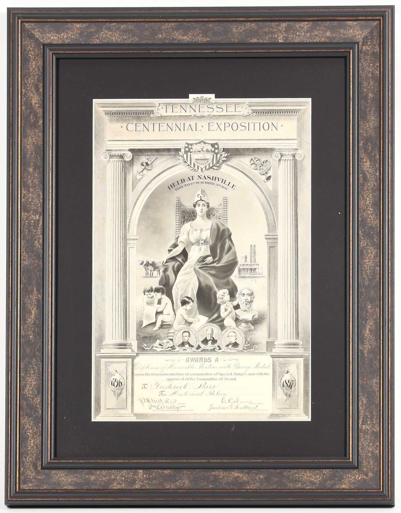 Beautifully and expertly framed large award certificate for the Tennessee Centennial Expo in 1897, presented to Frederick Starr for Historical relics, receiving a bronze medal. 21 x 27". Pristine clean and undamaged in any way.