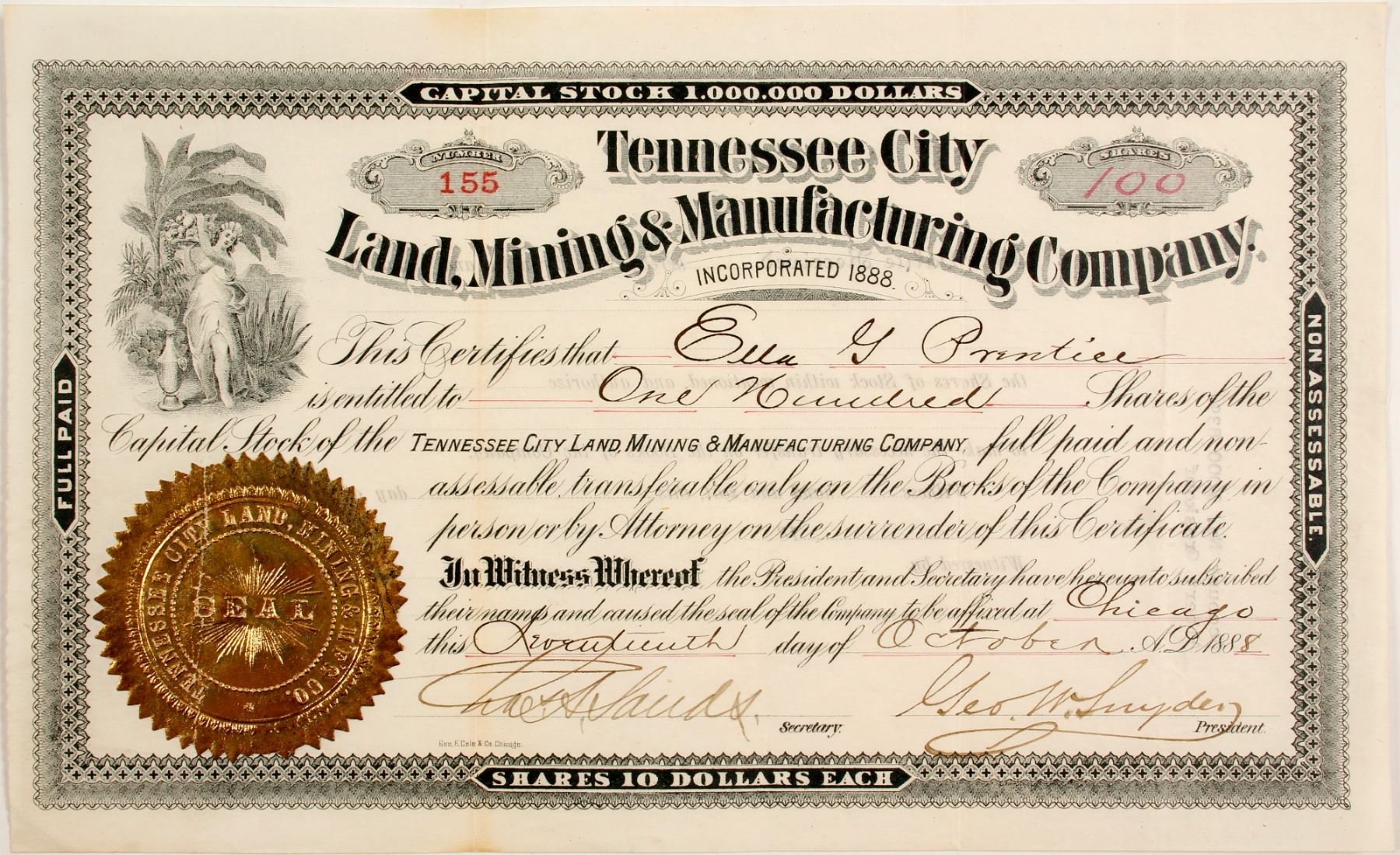 #155 for 100 shares to Ella G Prentice. Signed by secretary (?) and president George W Snyder. Dateline Chicago 1888. Incorporated in 1888. Not cancelled. Bright gold seal. Palm tree allegorial lady vignette. Printed by Geo. E. Cole Co. No edge, corner or discoloration issues. This certificate is rare from a rare location. Prag Collection