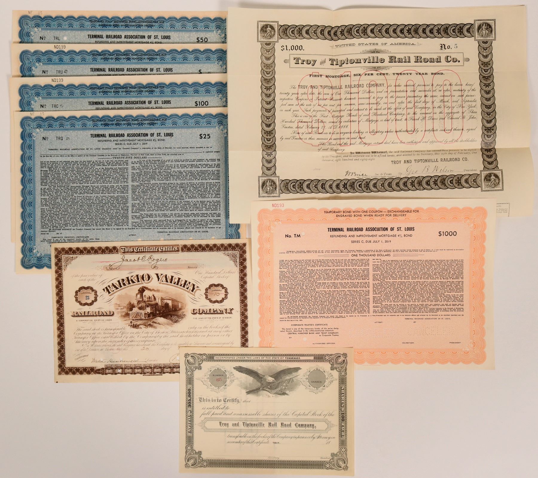 1. Troy and Tiptonville Rail Road Co - Two certificates. #5, I/U, $1000, 6%, First Mortgage 20 year Bond. Issued Feb 20, 1888 signed Geo. B. Wilson President. Black, embossed seal, allegorical figures in each corner, $1000 red outline underprint. Coupons attached 1-40. Chas. F. Ketcham & Co. printer. EF #65, U/U, $100 par shares, dateline 18__, vignette eagle wings spread holding American flag. Receipt attached. Chas F. Ketcham & Co. printer. AU. 2. Missouri Railroad Stock Group (6) 1. Five Certificates: Terminal Railroad Assoc. of St. Louis. founded in 1889 in a deal orchestrated by Jay Gould and is a switching and terminal railroad that handles traffic in the St. Louis, Missouri, metropolitan area. It is currently co-owned by several Class I railroads that reach the city. All certs have no vignette, are 4%, Series C Refunding and Improvement Mortgage Bonds, U/C, Columbian Bank Note Co printer VF-EF cond. Dateline July 1, 1944 or no date but due 2019. Three are Blue in denomination of $25, $50, $100 and one Orange $1000.