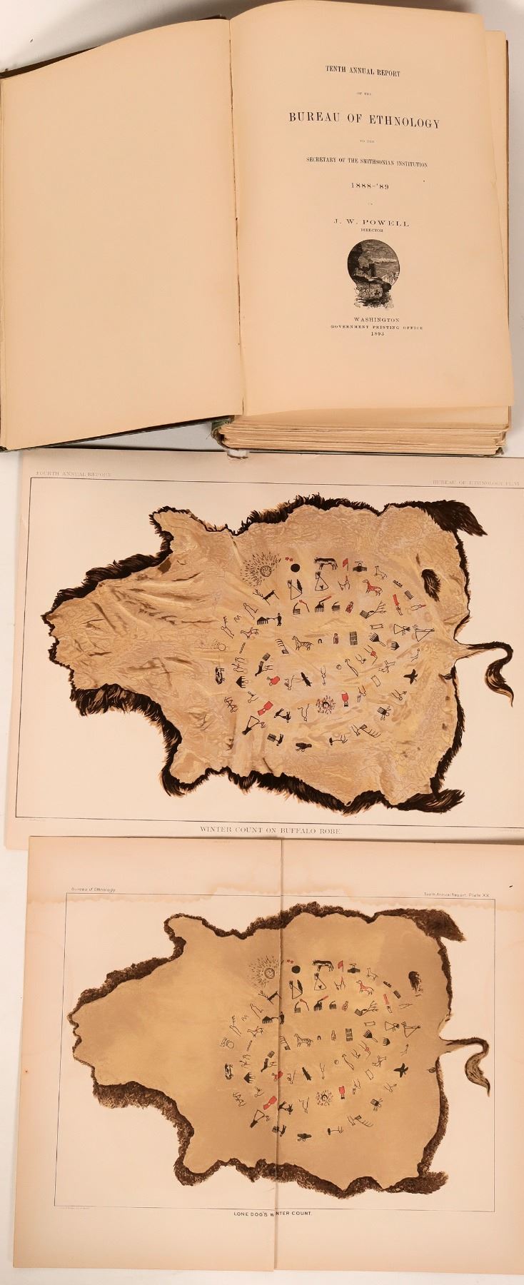 Lot of 3. 1) The Tenth Annual Report of the Bureau of Ethnology to the Smithsonian Institution 1888-1889 by J. W. Powell Director. Washington, Government Printing Office. Binding is in bad condition. This includes"Picture-writing of the American Indians" by Garrick Mallery. Hardcover-green. Corners worn. No dj.Includes two maps. 1) From the Bureau of Ethnology- Tenth Annual Report. Plate XX. Rock Art Symbols. Lone Dog's Winter Count. 11' x 14'. 2) Fourth Annual Report. Bureau of Ethnology PL. VI. Winter Count on Buffalo Robe. 11' x 14'.