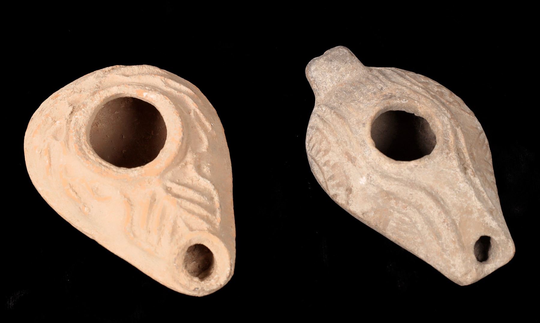 Two terra cotta oil lamps, each about four inches long. No documentation.