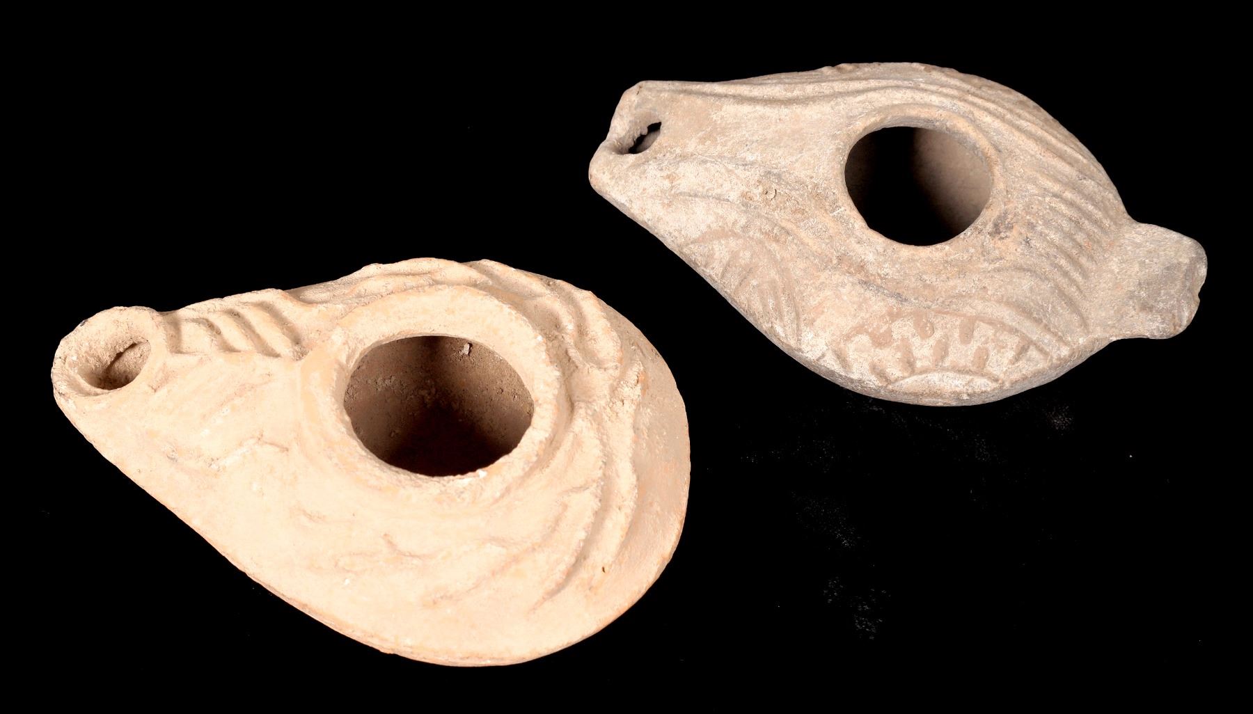 Two terra cotta oil lamps, each about four inches long. No documentation. Gary Bracken Collection