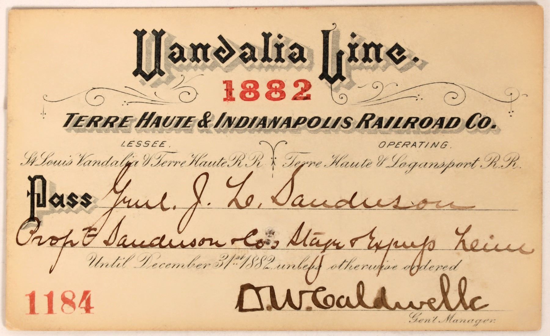 1882 Terre Haute & Indianapolis RR, Vandalia Line pass. Hand signed by D W Caldwell.