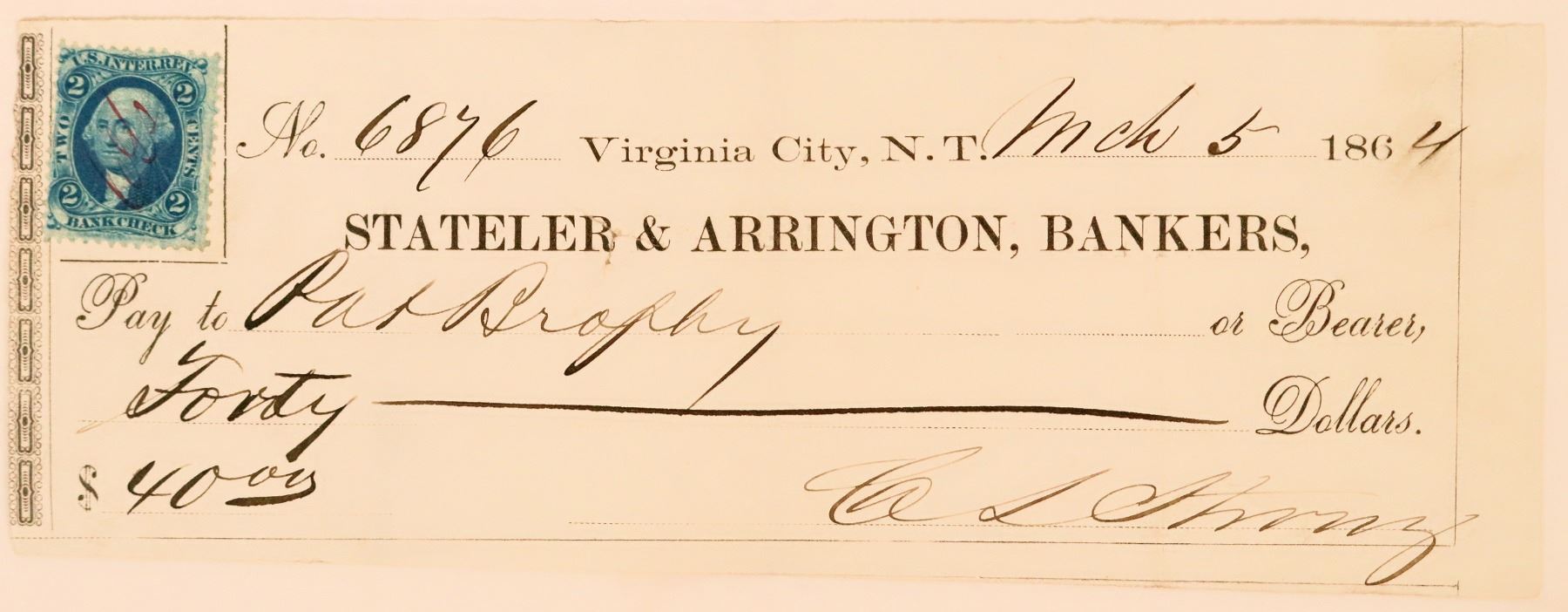 Stateler & Arrington, Bankers, check issued March 5, 1864, to Pat Brophy. Signed by Charles Strong (as supt. for the Gould & Curry). Two cent adhesive revenue attached at upper left. Cut cancelled. Not endorsed by Brophy. The Brophy Mine was located in the Flowery District, adjacent to Virginia City. On May 19, 1888, E&MJ reports that work is being resumed in the mine and ore is being extracted from the main tunnel. An incline in the North Bonanza will help them intersect the vein in the Brophy at low cost.