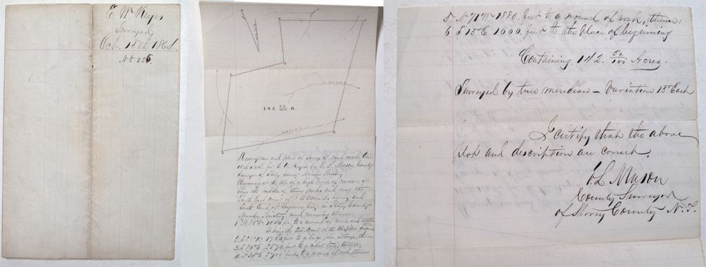 This survey done by county surveyor E. L. Mason is a description of a plot of land made for E. W. Keyes. This 145.52 acre survey starts from corner of old hospital. Hand drawn map on top of survey. One fold is ripped half way through map and can use museum quality tape to protect it. Edward Keyes - at first glance - seems like one of those merchants who came to Virginia City to make money selling goods and not mining for gold. But…wait, the Territorial document to the left and on the next pages show us that he was also looking for that elusive golden treasure! Nobody was immune! Additional notes on Keyes and surveyor Mason.