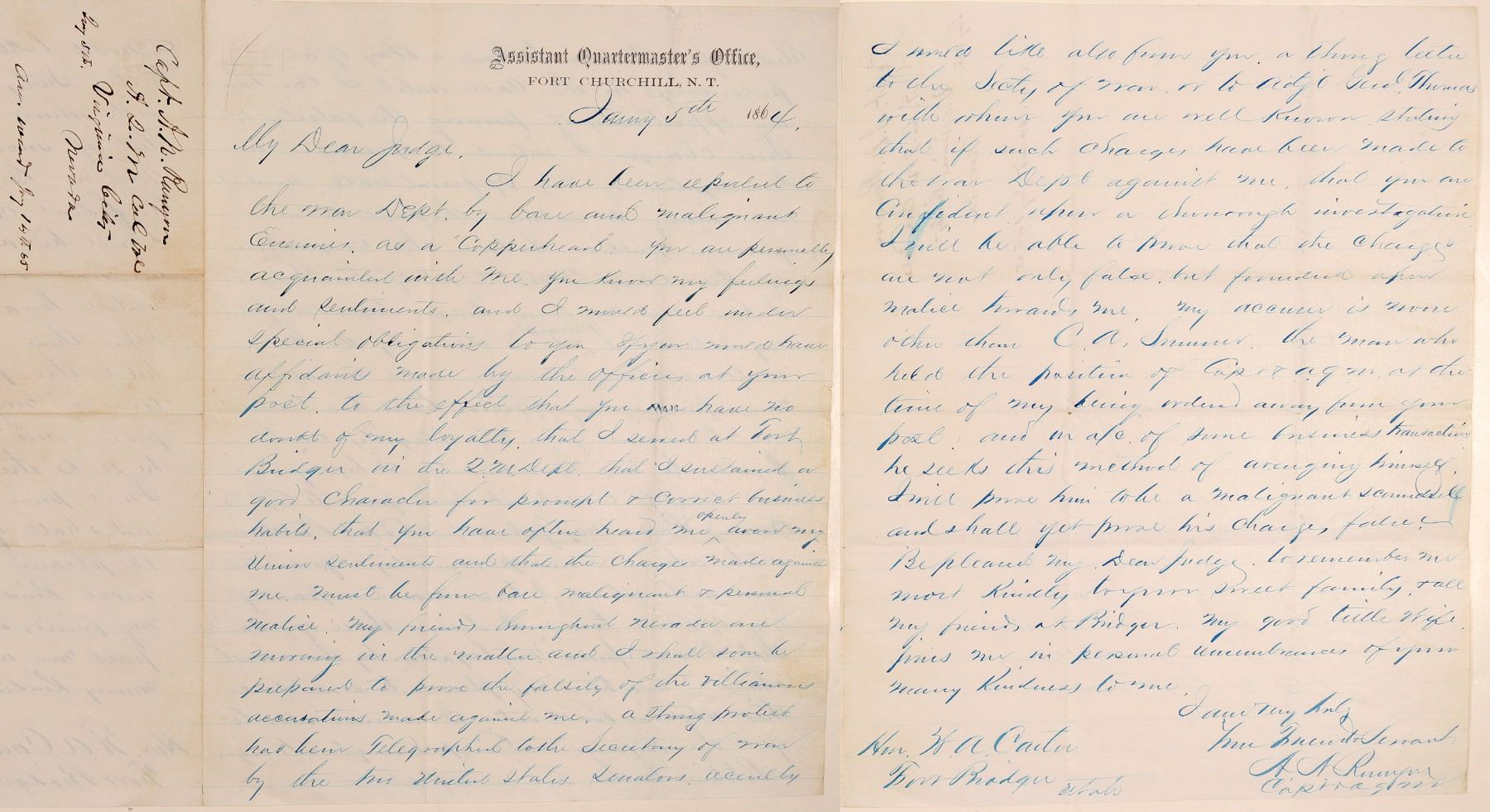 Rare and historic. The letter is addressed to Judge Carter, who was a post trader at Fort Bridger. AM Rumyon(?) has written this letter on Assistant Quartermaster's Office letterhead. Dateline Fort Churchill, NT, January 5, 1864. It seems he has been accused of being a Copperhead - a Southern sympathizer. He is asking his friend Judge Carter to vouch that he is loyal by providing a Declaration of Loyalty!Three full pages of writing. Fort Churchill was situated near Virginia City (mining wealth) and Carson City (capital). it was located on the Pony Express route and very near the wagon trade route. But it was in the middle of the Nevada desert - a most uncomfortable place for a fort. Desertion was high and the need was minimal. The Pyramid Lake Indian Battles brought the fort to life, but there were no more Indian problems here after that!