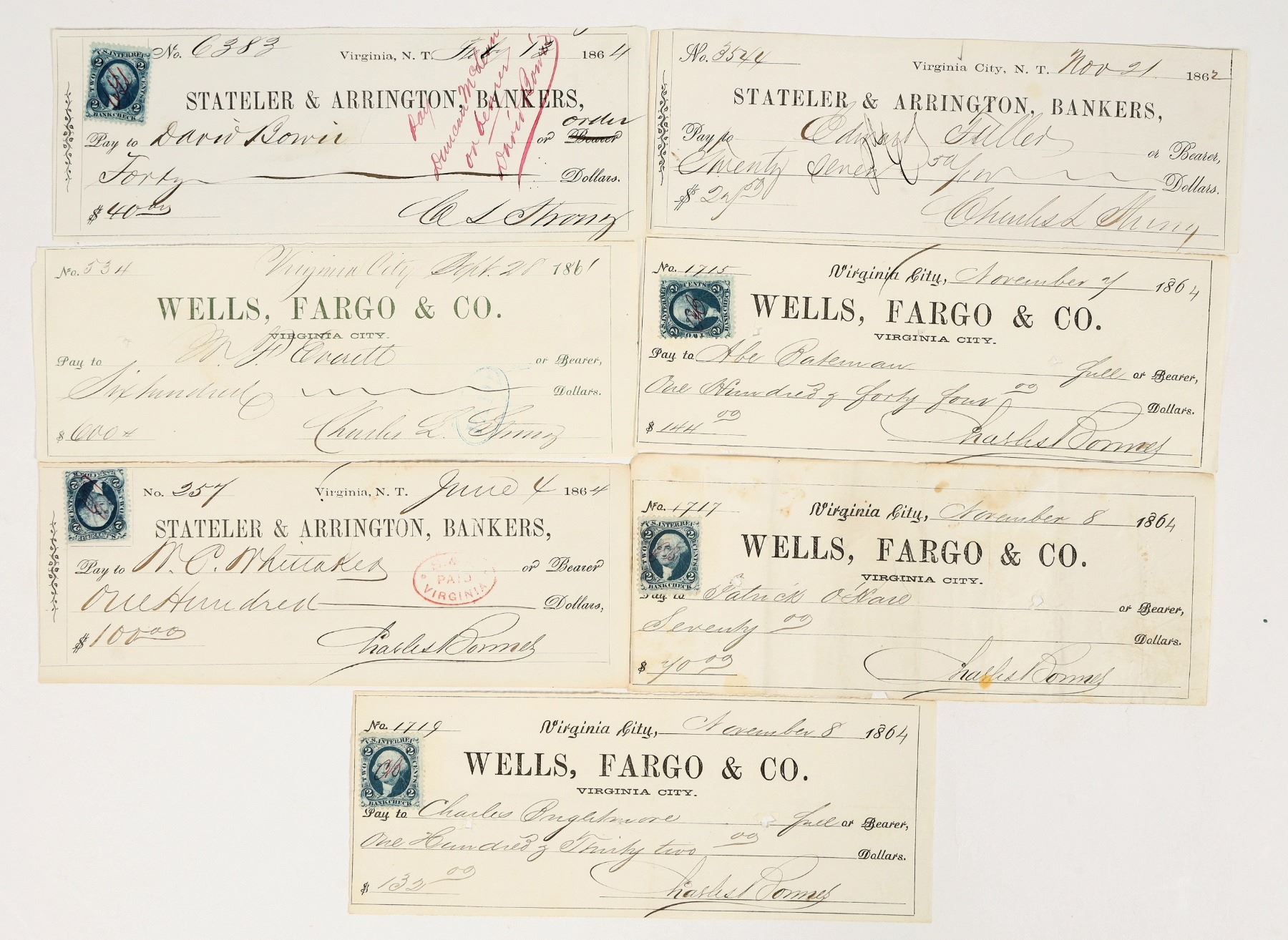 Lot of 7 checks issued for the Gould & Curry Mine pre-Nevada statehood in Oct. 1863. Includes: very early 1861 Wells Fargo signed by Charles Strong; three 1864 Wells Fargo signed by Charles Bonner, who replaced Strong; and 3 Stateler & Arrington checks, 1862-64, signed by either Bonner or Strong. Nice territorial group!
