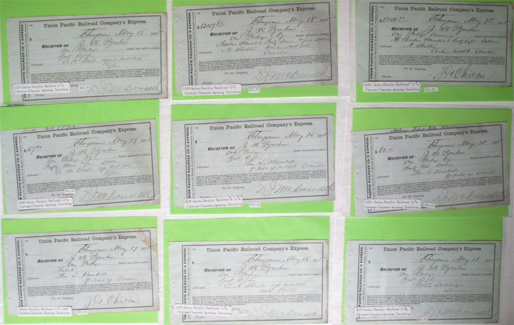 Nine pieces. All Union Pacific Railroad Company Express 1875 receipts from J. H. Pinchim(?) of Cheyenne to various recipients in Ogden, Omaha, Carlin, and North Platte. Date c1875 , WY hwac 9529