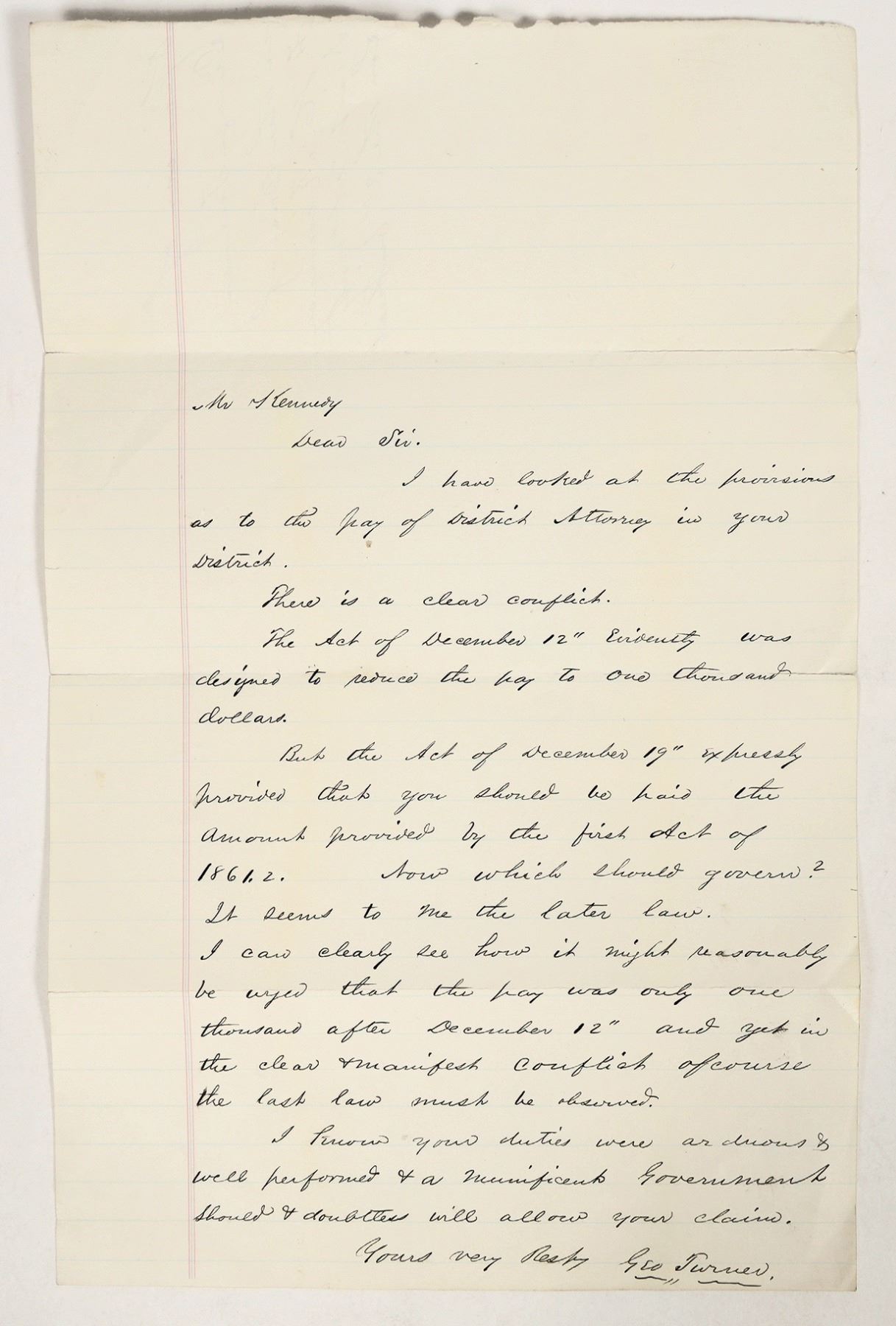 A holographic legal document, undated, written by Judge George Turner, a Lincoln appointee. Having taken office in Sept. 1861, he and other members of the Territorial Supreme Court flamed out in 1864. Turner wrote this opinion relative to a pair of territorial statutes following the Territorial Legislature session of 1862. He was a young attorney in Portsmouth, Ohio when President Lincoln appointed him chief justice for the new territory. Then, in Nevada, the public lost confidence in the court, and in August 1864 Turner resigned and took all of his papers with him. Those papers have never surfaced among collectors, making this document extremely rare. Turner was a notoriously poor public speaker, believed to have been lampooned in 1863 by Samuel Clemens writing as "Josh." 12.5 x 8"
