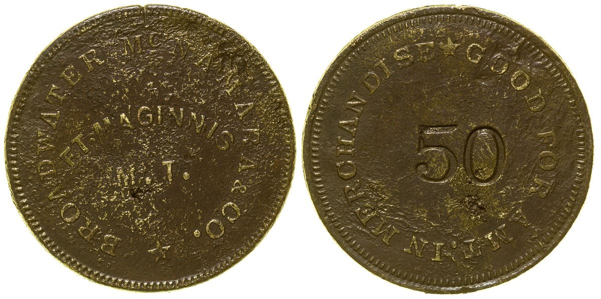 Broadwater, McNara & Co. / 50 / in merchandise. Rare territorial military token. Pitted surface but strong lettering. City: Ft. Maginnis State: Montana Date: ID# 45214