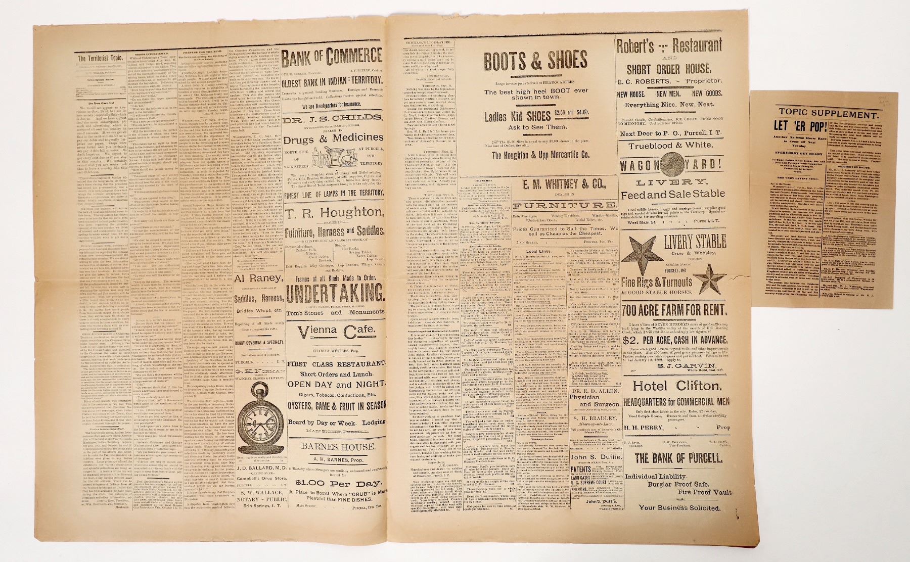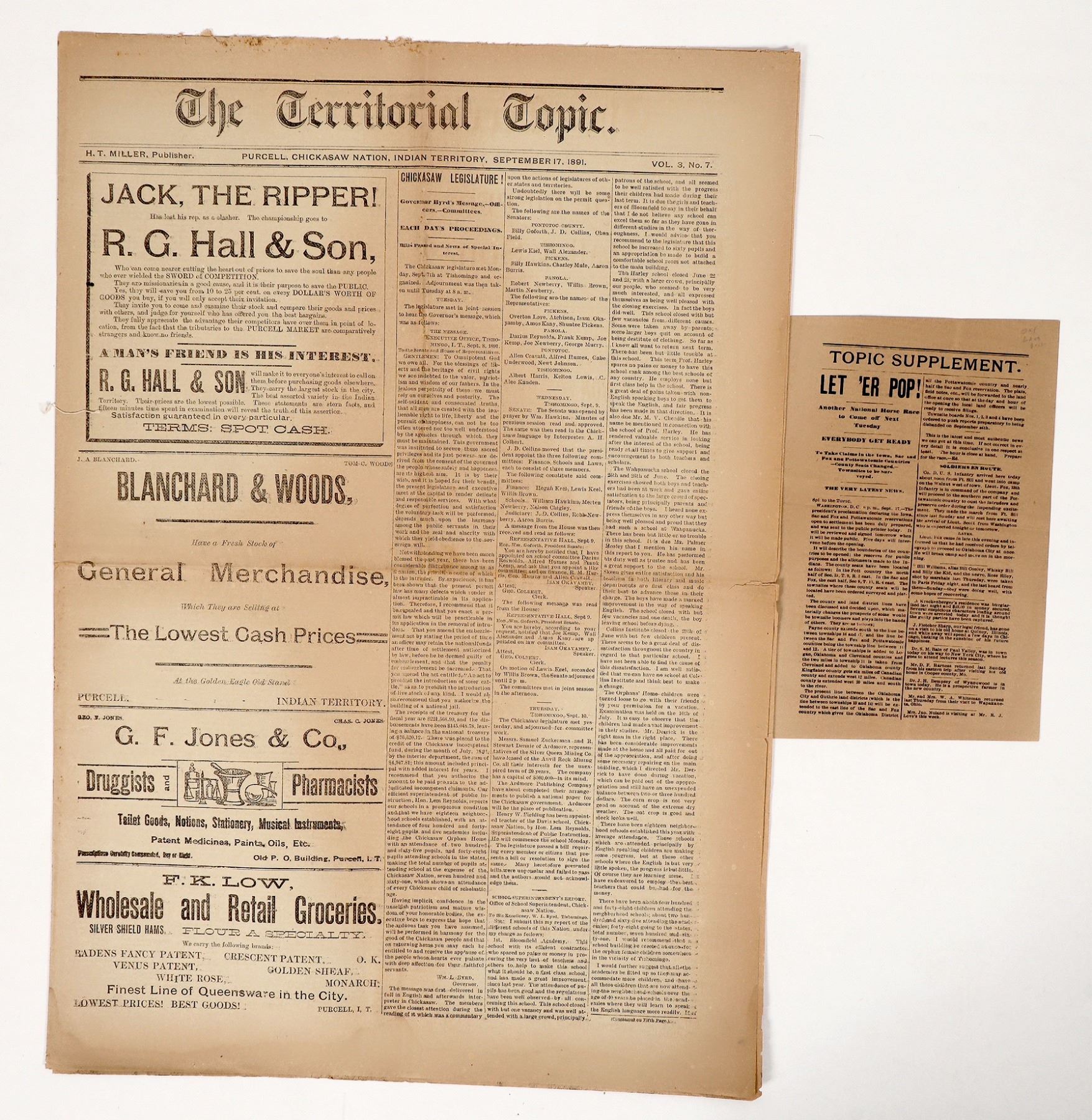 Sept 17, 1891 Territorial Topic and rare blank back broadside supplement, 9x6" containing prominent stacked headlines, "Let'er Pop/Another National Horse Race/to Come Off Next/Tuesday/Everybody Get Ready." This broadside was published by a rare Native American Publication, Territorial Topic and covers the upcoming Oklahoma Land Rush of 1891, also known as the Land Run of 1891. It took place on Sept 22, 1891 and involved the opening of lands previously belonging to the Iowa, Fox, Potawatomi and Shawnee tribes, allowing settlers to claim 160 acre homesteads through a race to stake their claim, this event is considered one of the major Oklahoma Land Runs. Also, upper left front page ad, "Jack the Ripper/Has lost his rep as a slasher."