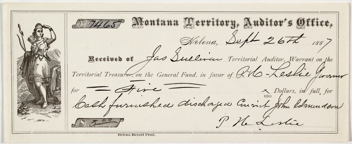 Montana Territory, Auditor's Office pictorial warrant No. 17465, issued for $5 for a discharged convict. Signed by Montana Territorial Governor P.H. Leslie. Previously, Leslie was also governor of Kentucky. As a result of his pro-temperance position, he was unpopular and removed from office by President Harrison after two years. 3.5" x 8.5" Helena Herald Print. Very fine. City: Helena State: Montana Date: 1887 ID: 36659