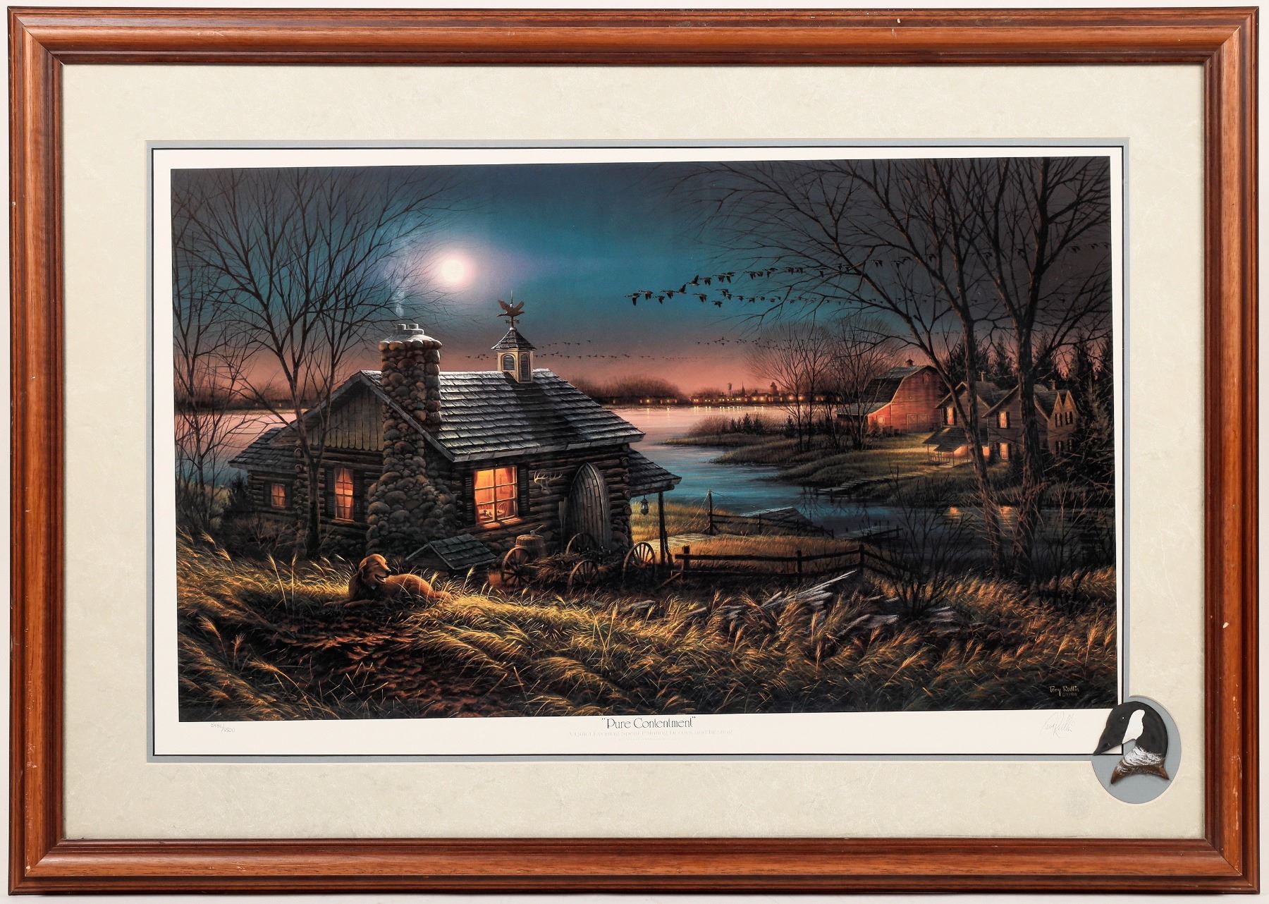 Pure Contentment print by Terry Redlin, #8486/9500. A flock of geese is heading toward a water landing. Signed by artist in lower right with a wood painted goose head next to signature. Frame 22x32".
