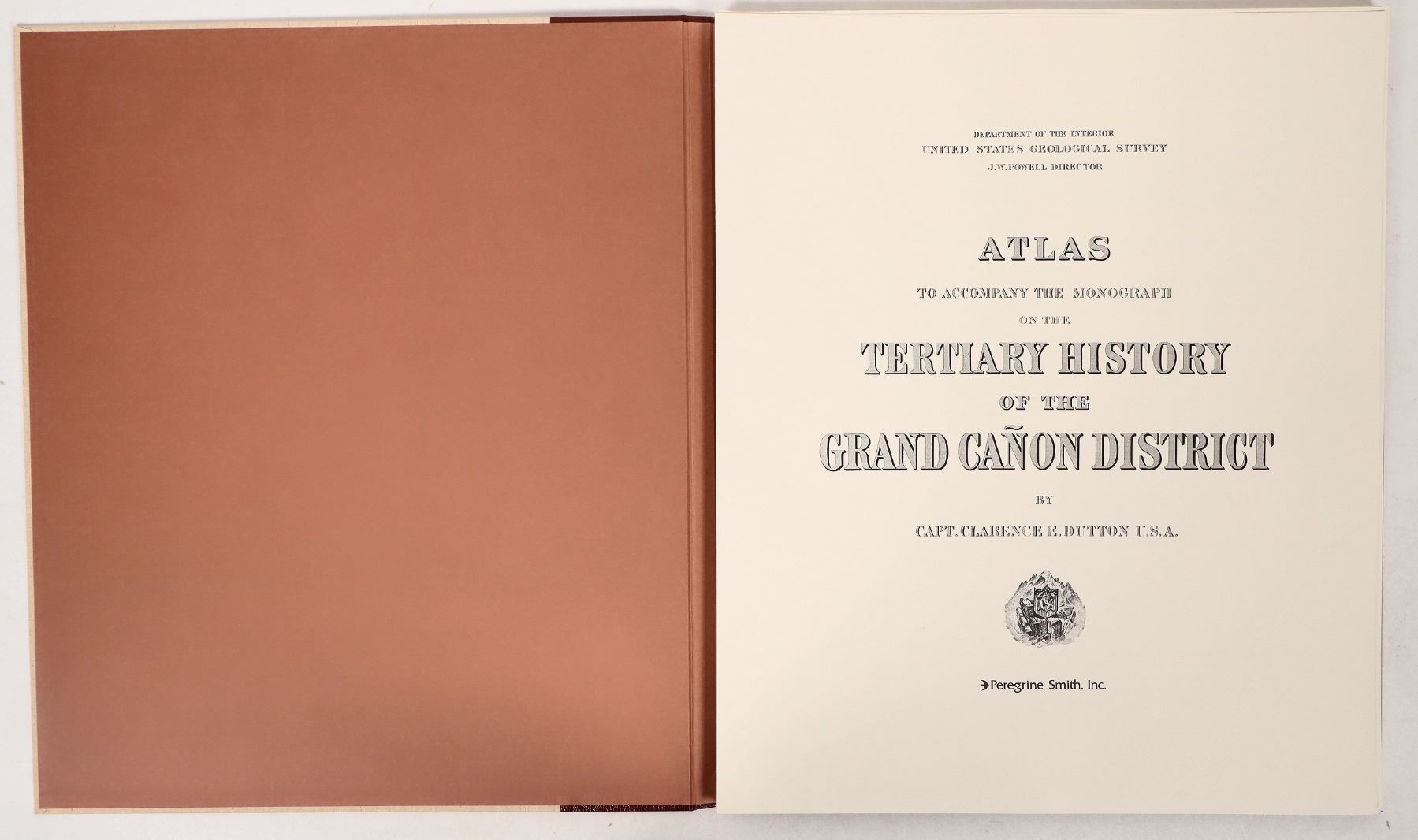 Tertiary History of the Grand Canon District by Clarence E Dutton. Perigrine Smith reprint of this 1882 classic. A preeminent work on the Grand Canyon with maps and panoramas. William Henry Holmes was the field artist. In slipcase with lower crack and upper toning. 20x17".