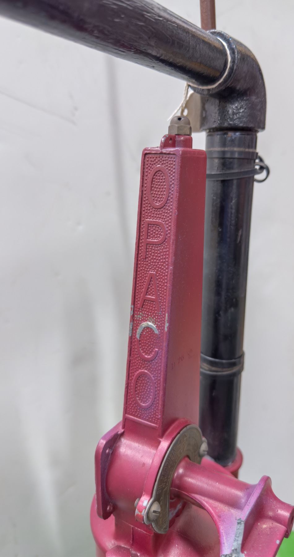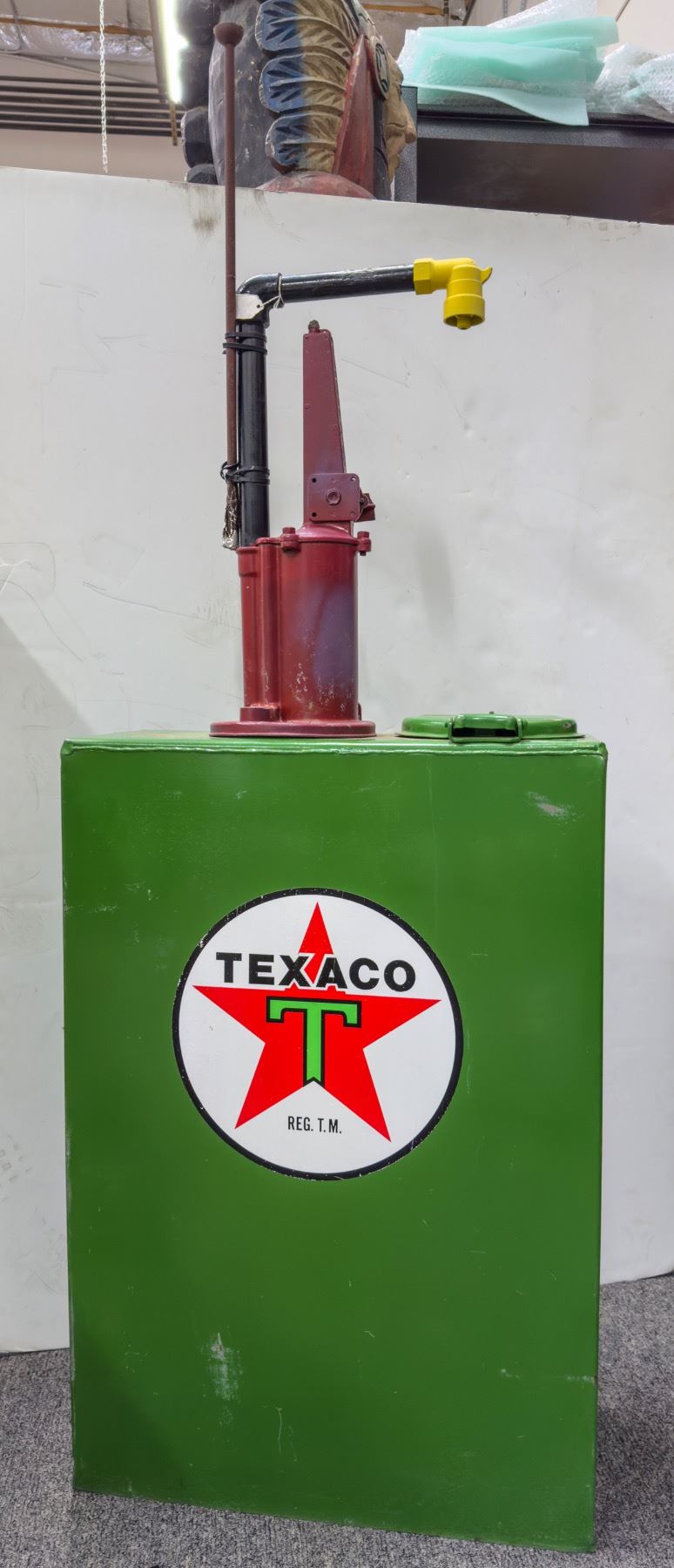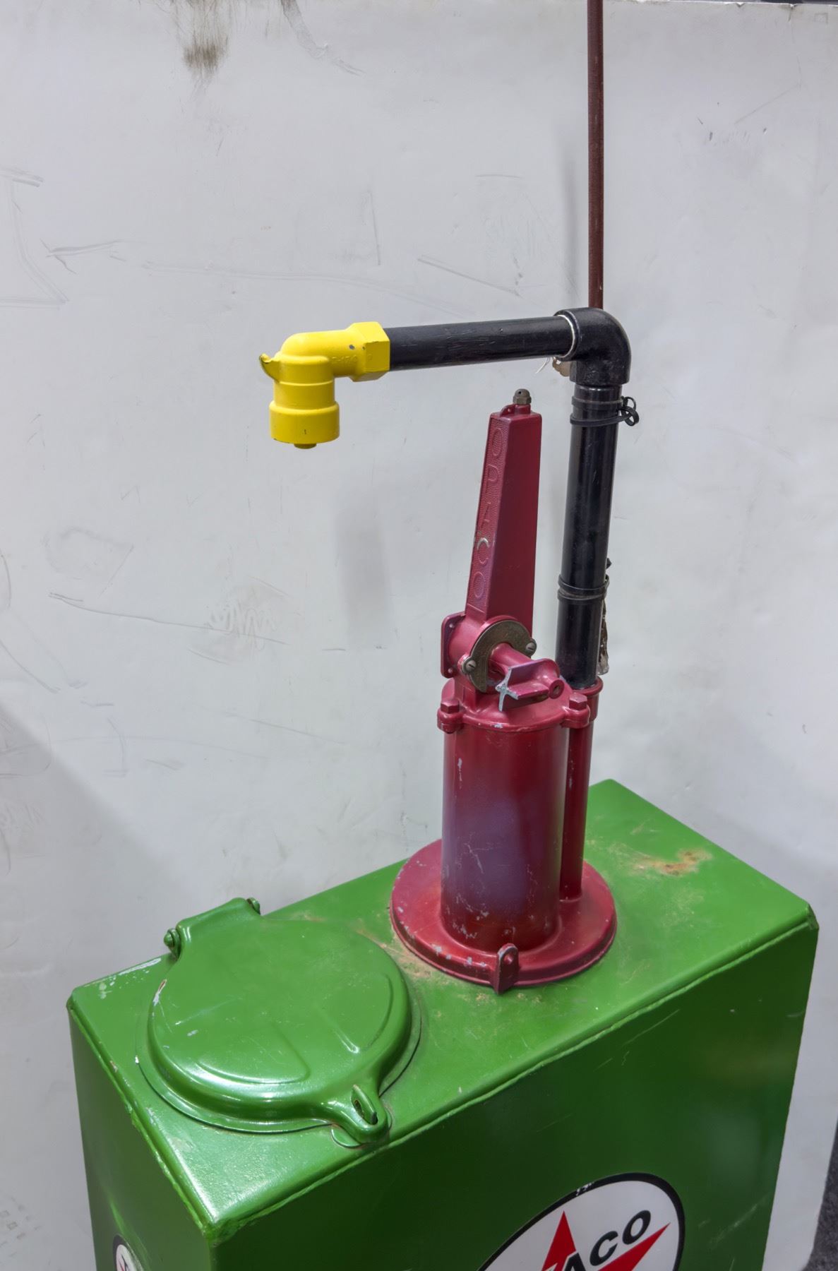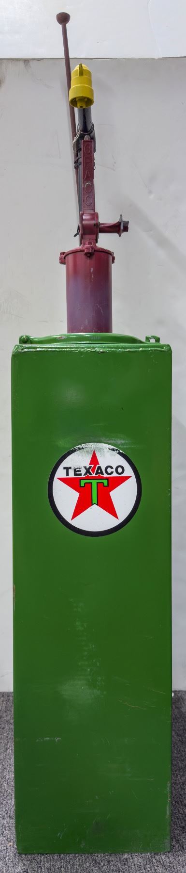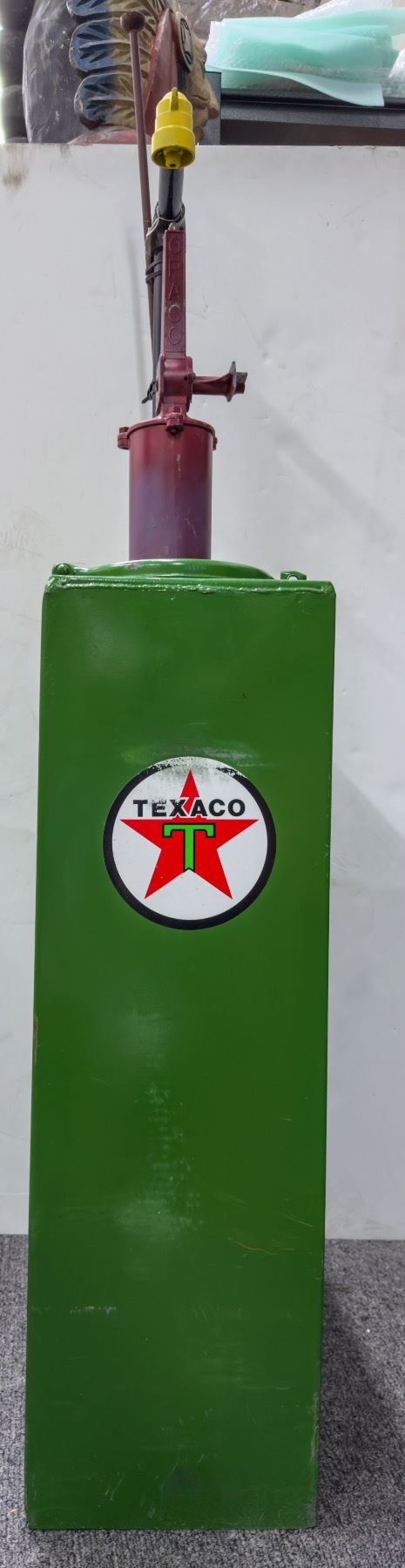 Texaco oil or gas pump in good condition. Some wear (scratches, scuffs, and dings) have worn through the paint in small areas; see photo. The padlock to lock the 7" hatch closed is not included. The hinge moves fluidly. Comes with a rusted metal accessory. "OPACO" in raised lettering on the red pipe base.