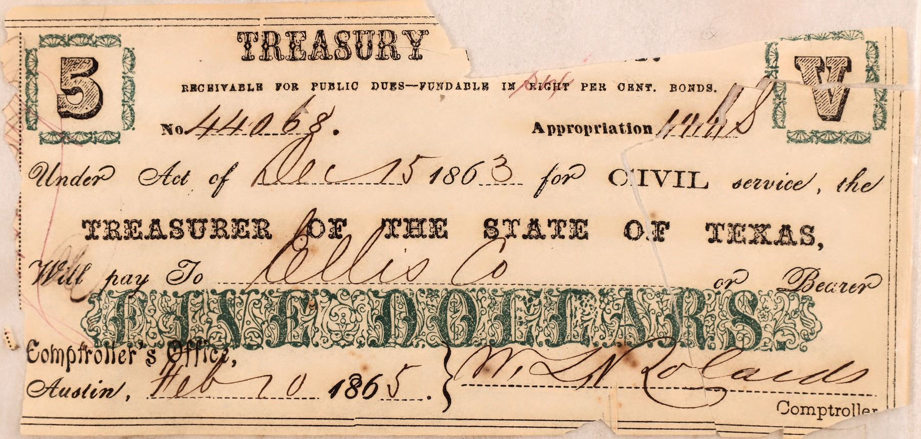 As is condition Texas currency: under the act of Dec. 15, 1863 for civil service, the treasurer of the State of Texas will pay to Ellis Co. five dollars. Signed at Austin by the comptroller Feb. 20, 1865. Rough around the edges. Texas Robert Coelln Collection