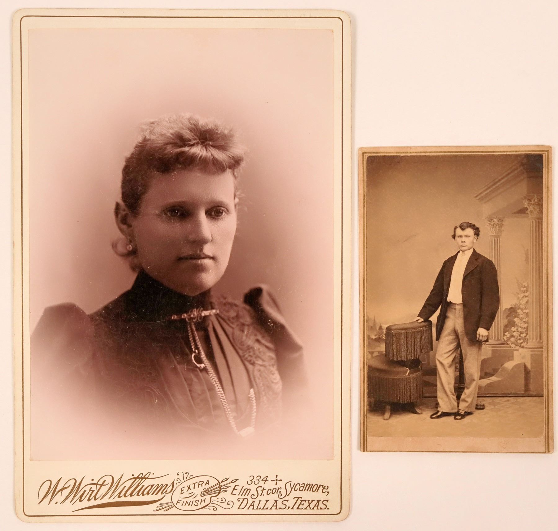 Very clear sepia toned photo of 1860's woman measures 4 x 6 inches. Has gold line around frame and photographer's identifying logo, W. Wirt Williams, Extra Finish, 334 Elm St. cor. Sycamore, Dallas, Texas.